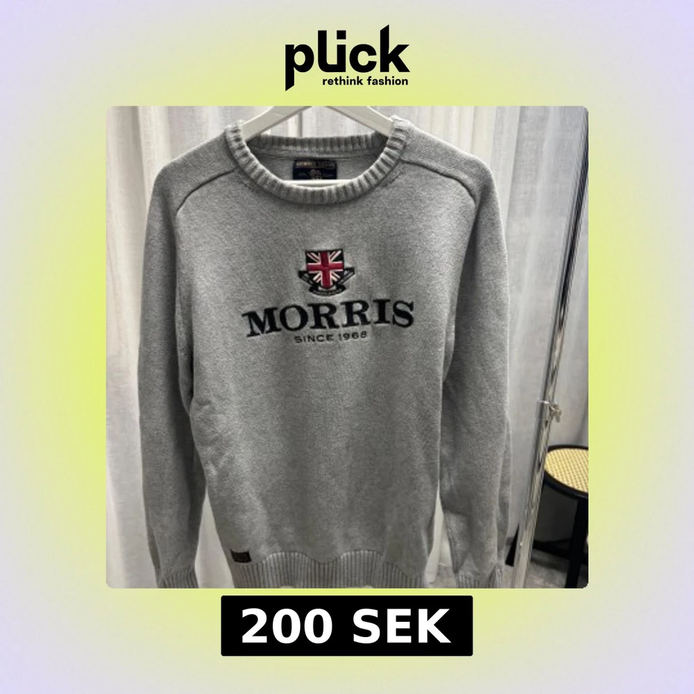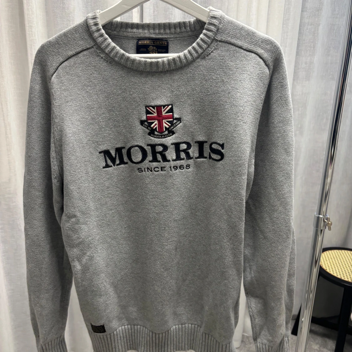 Snygg grå stickad tröja från Morris Gents med broderad logga och brittisk flagga på bröstet. Tröjan har rund halsringning, ribbade muddar.