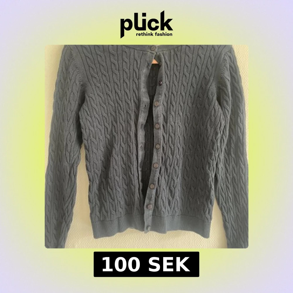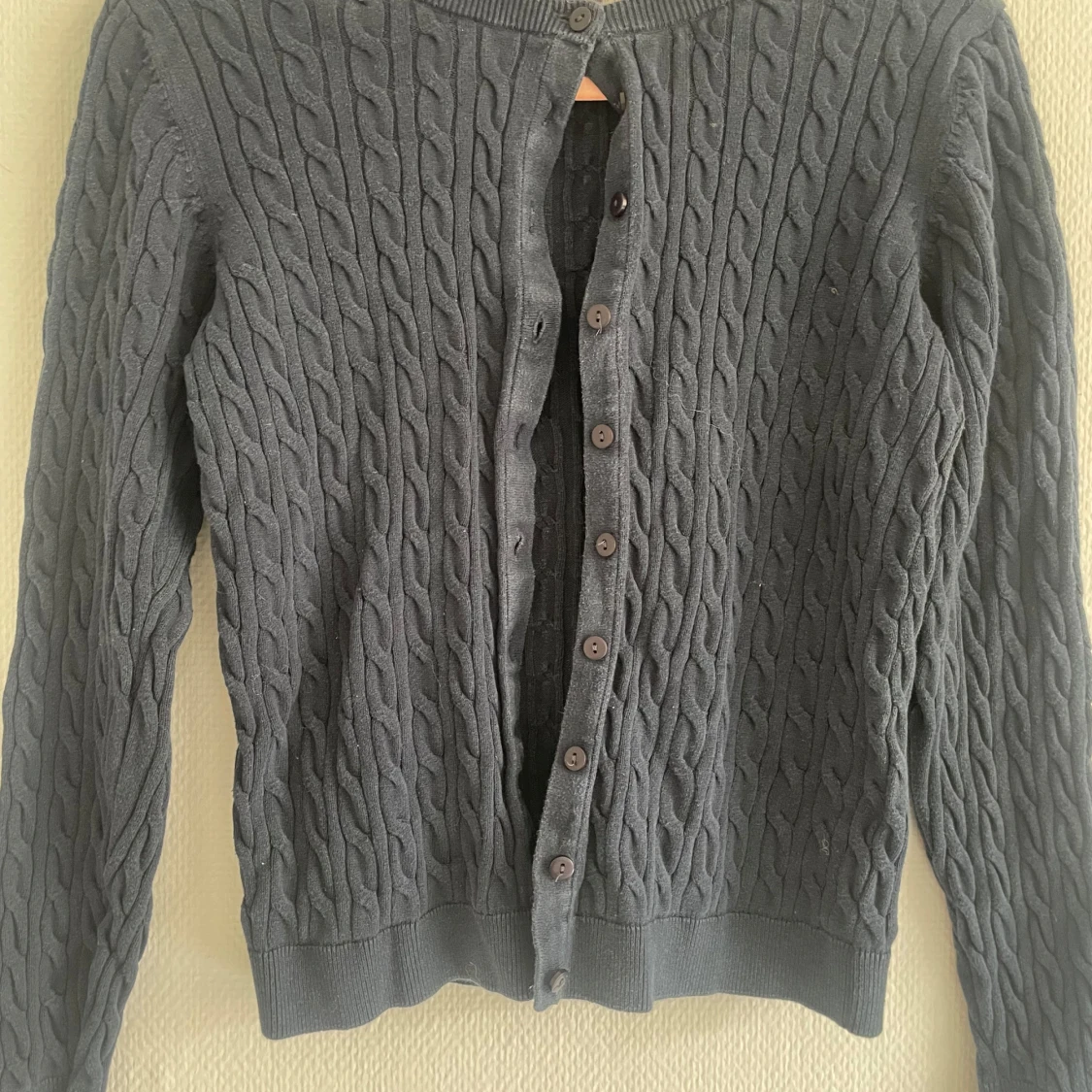 Mysig blå kofta med kabelstickat mönster och knappar framtill. Långärmad modell med ribbade muddar vid ärmslut och nederkant. Perfekt att slänga på sig över en t-shirt eller blus.