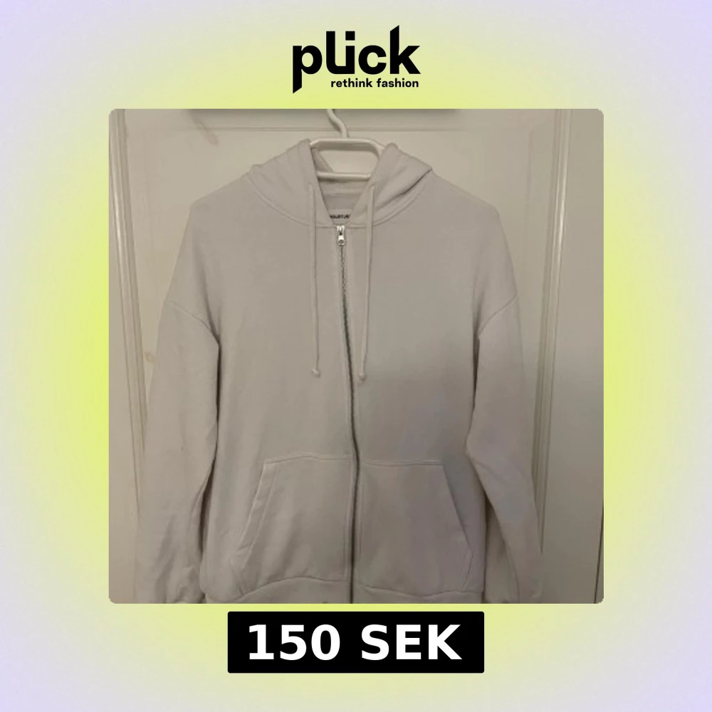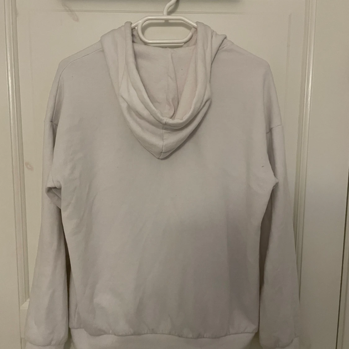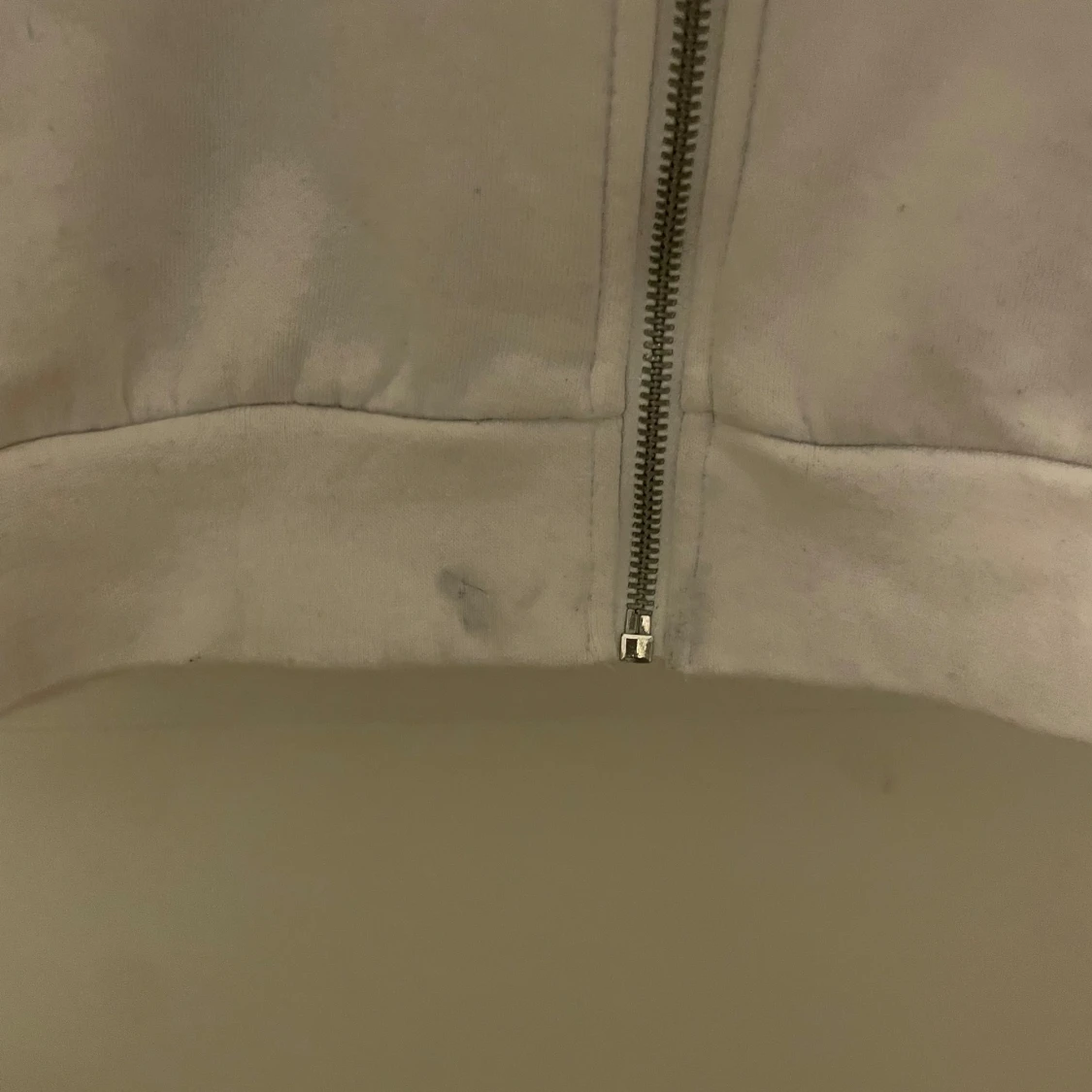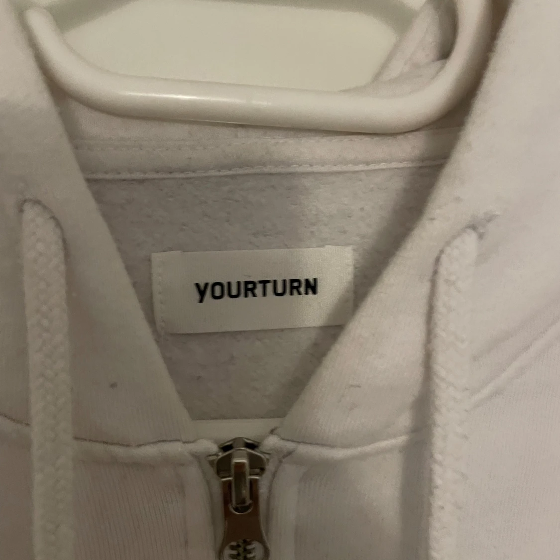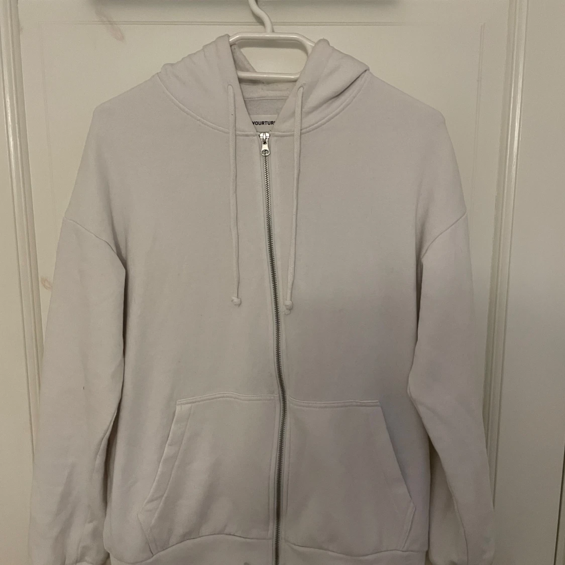 Säljer en enkel vit hoodie från YOURTURN med dragkedja framtill och två fickor. Tröjan har huva med dragsko och långa ärmar. Perfekt för en avslappnad stil. Fläck på sista bilden