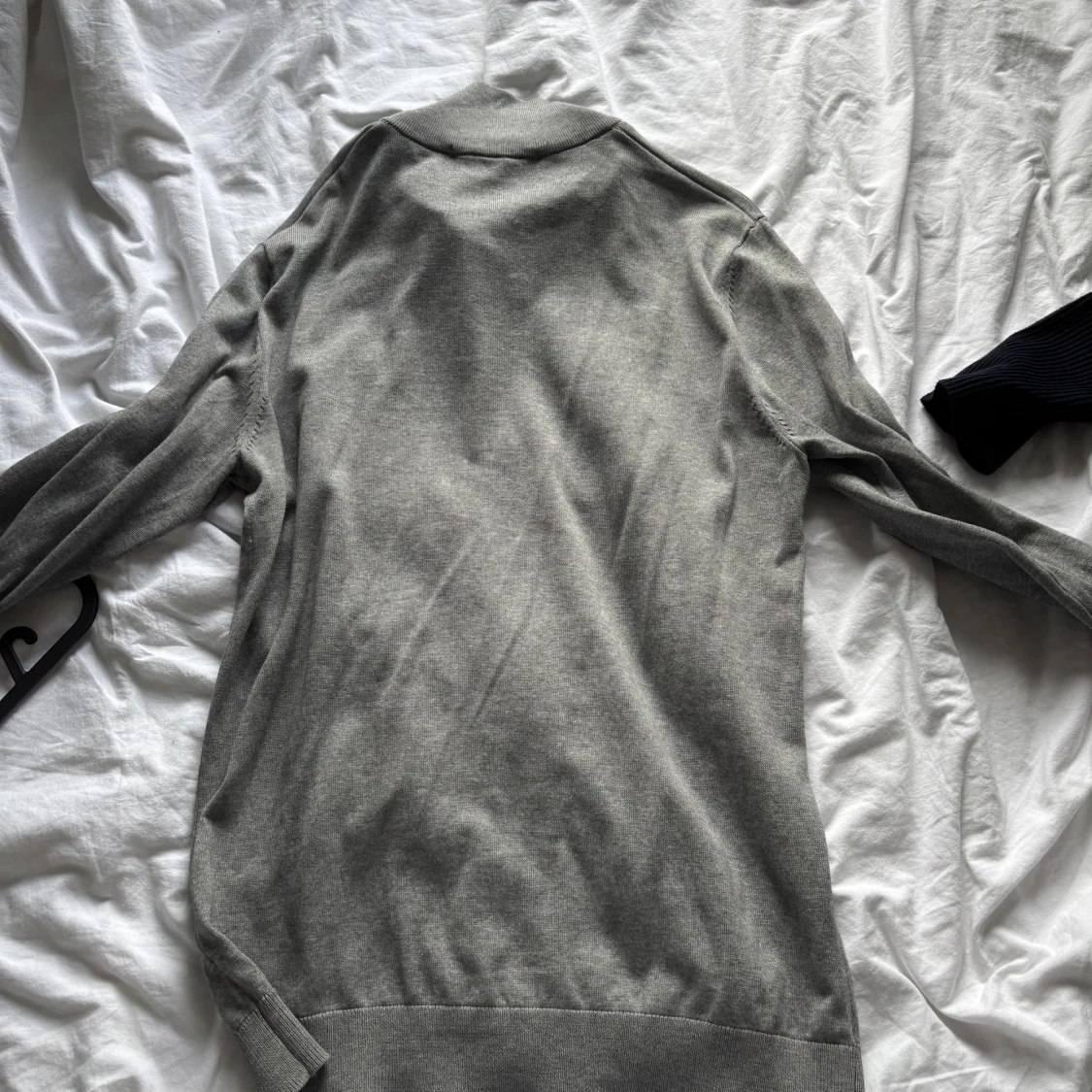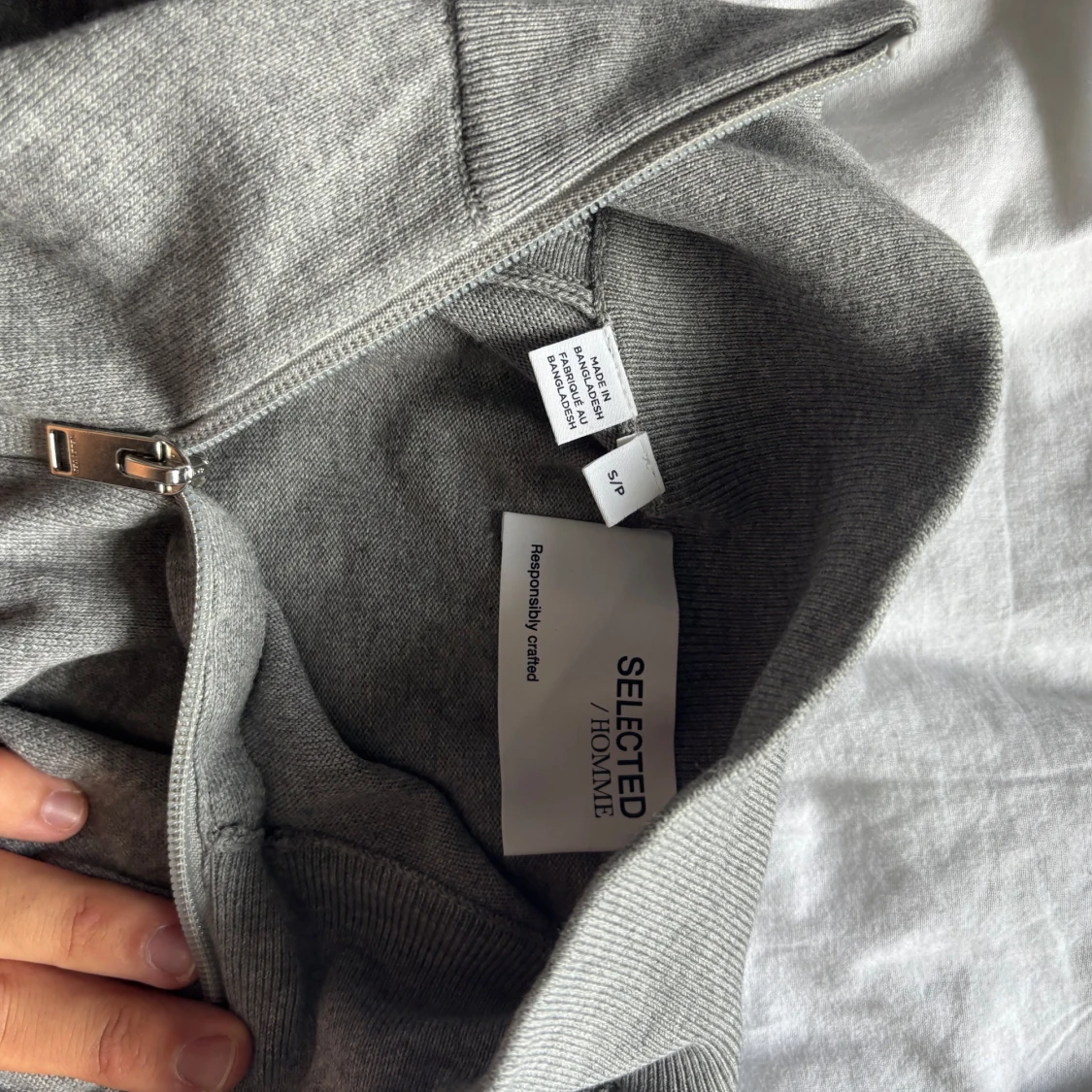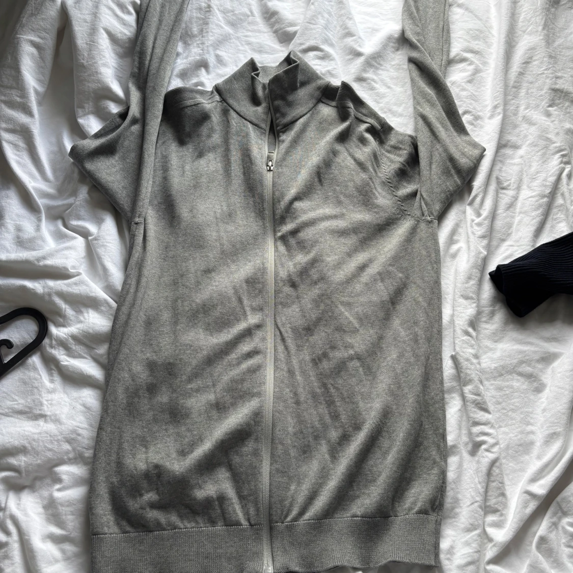 Säljer en stilren grå ziptröja från Selected Homme. Tröjan har hög krage, hel dragkedja framtill och ribbade muddar. Perfekt för lager-på-lager och enkel att matcha med andra plagg.