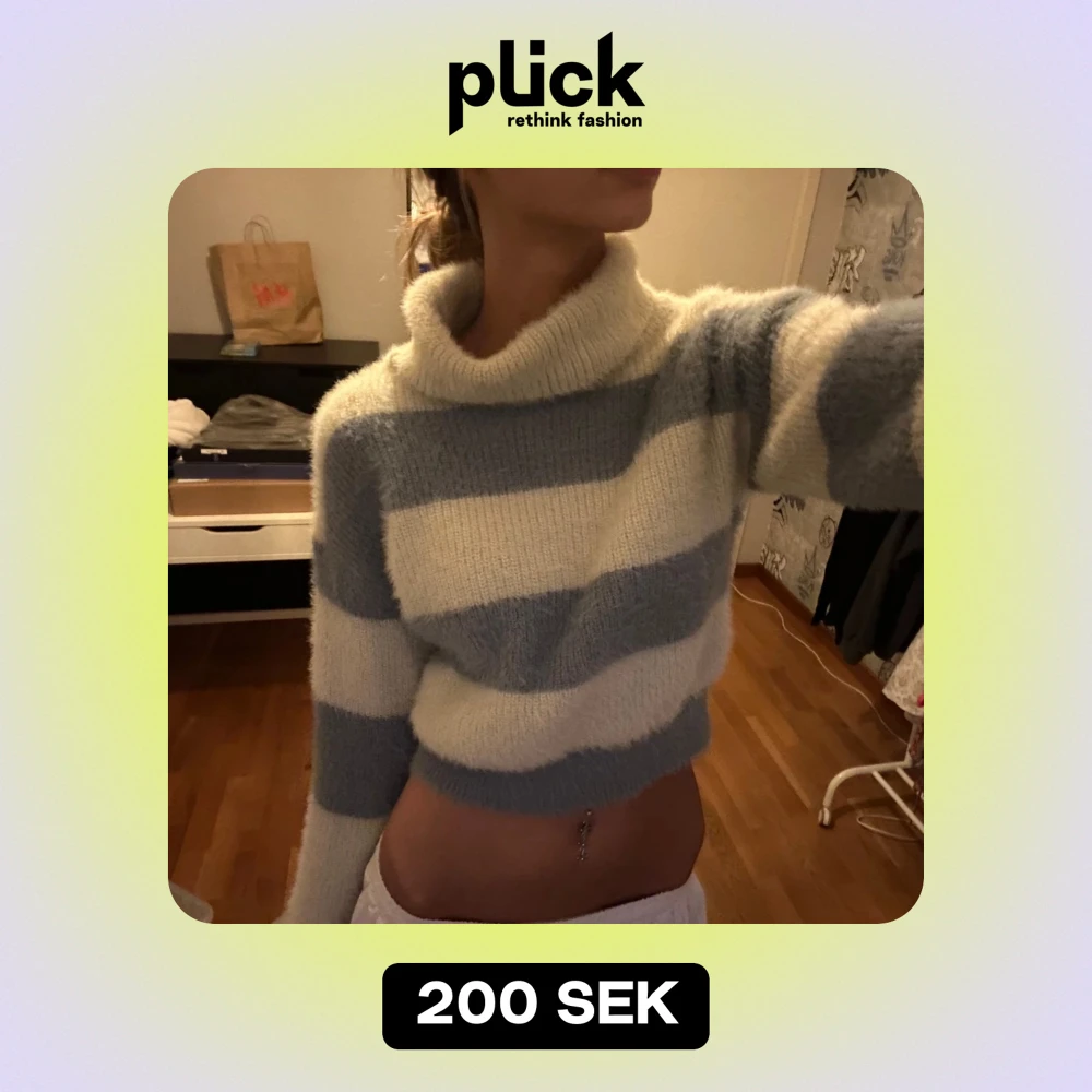 Säljer en supermysig randig tröja i blått och vitt. Den är croppad och har en skön, lös passform med långa ärmar. Perfekt för höst och vinter när du vill vara både varm och stilren. Tröjan är i mycket bra skick och passar perfekt till både jeans och kjol. 🧶✨