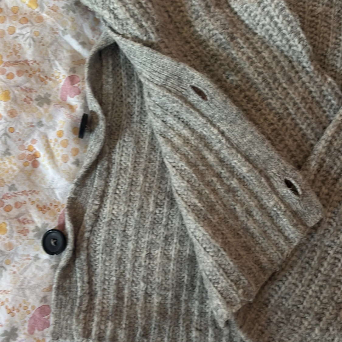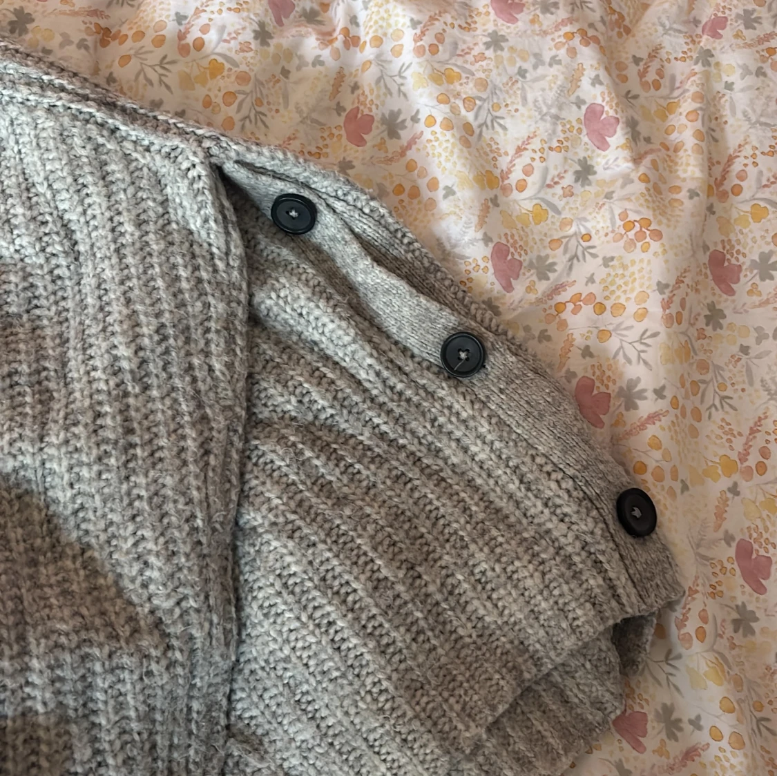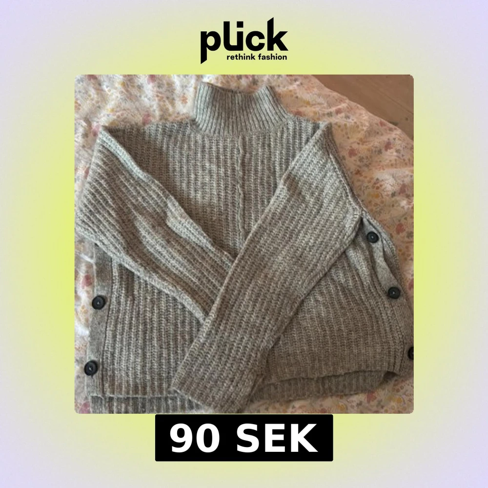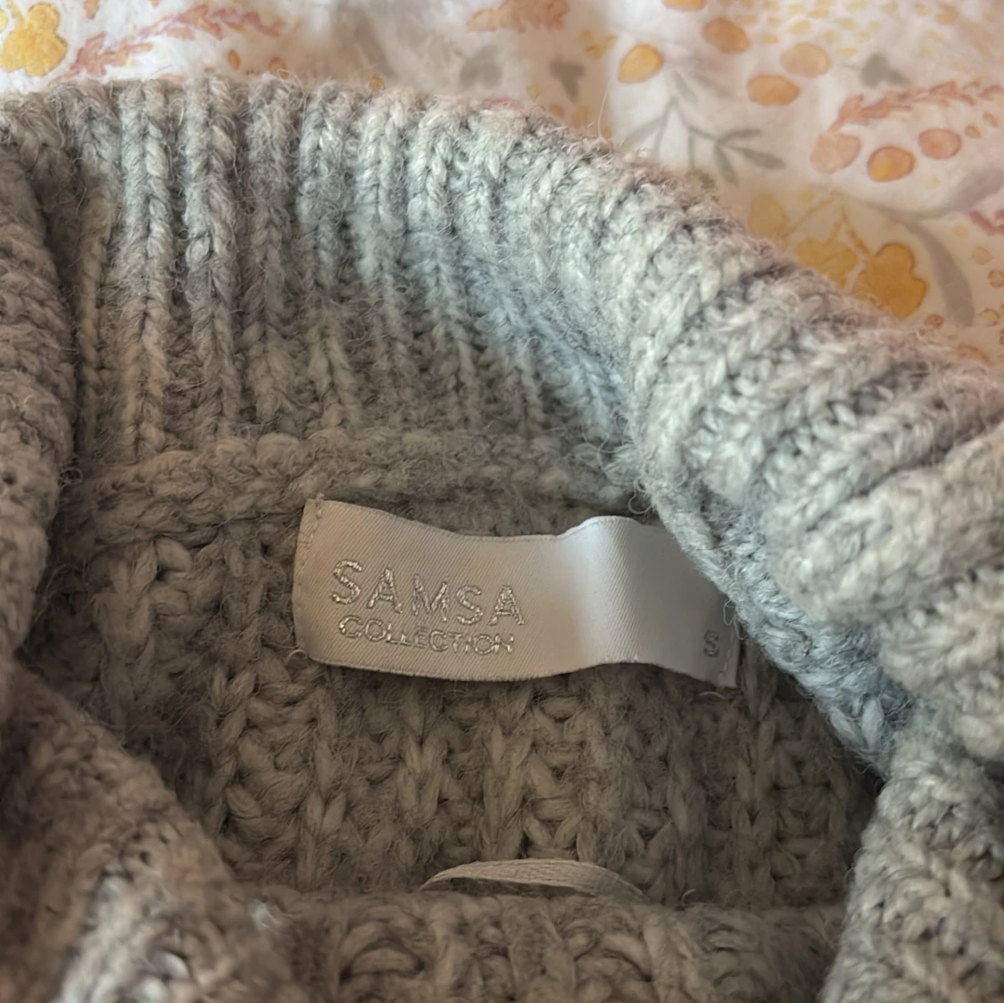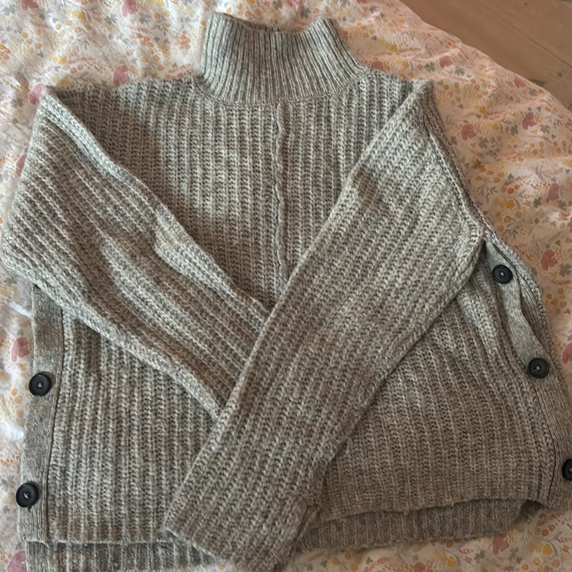 Säljer en chunky grå stickad tröja från Samsa Collection. Tröjan har hög krage, långa ärmar och coola knappar längs sidorna. Perfekt för lager-på-lager och chill höst- eller vinterstil. Supermjuk och varm, passar dig som gillar en lite loose fit. Det finns även något litet hål på den men det syns knappt
