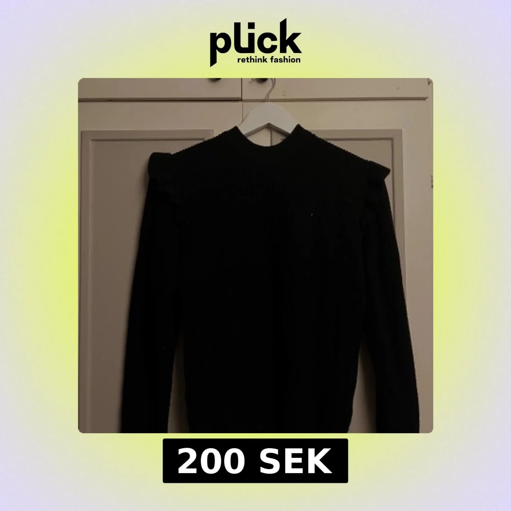 Svart stickad tröja från Object i storlek S. Tröjan har lång ärm, ribbad struktur och snygga volangdetaljer vid axlarna. Nästan helt ny!