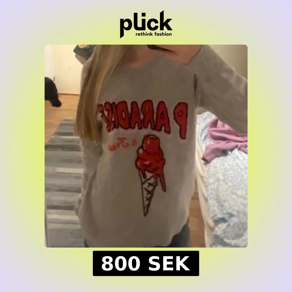 Säljer en beige stickad tröja med tryck i rött och orange som säger 'PARADISE' och har en glass i strut på framsidan. Tröjan har lång ärm och en avslappnad passform, perfekt för dig som gillar coola prints och vill sticka ut lite extra.