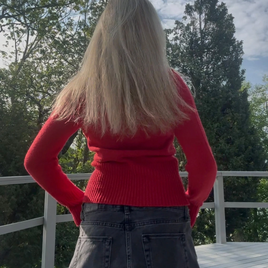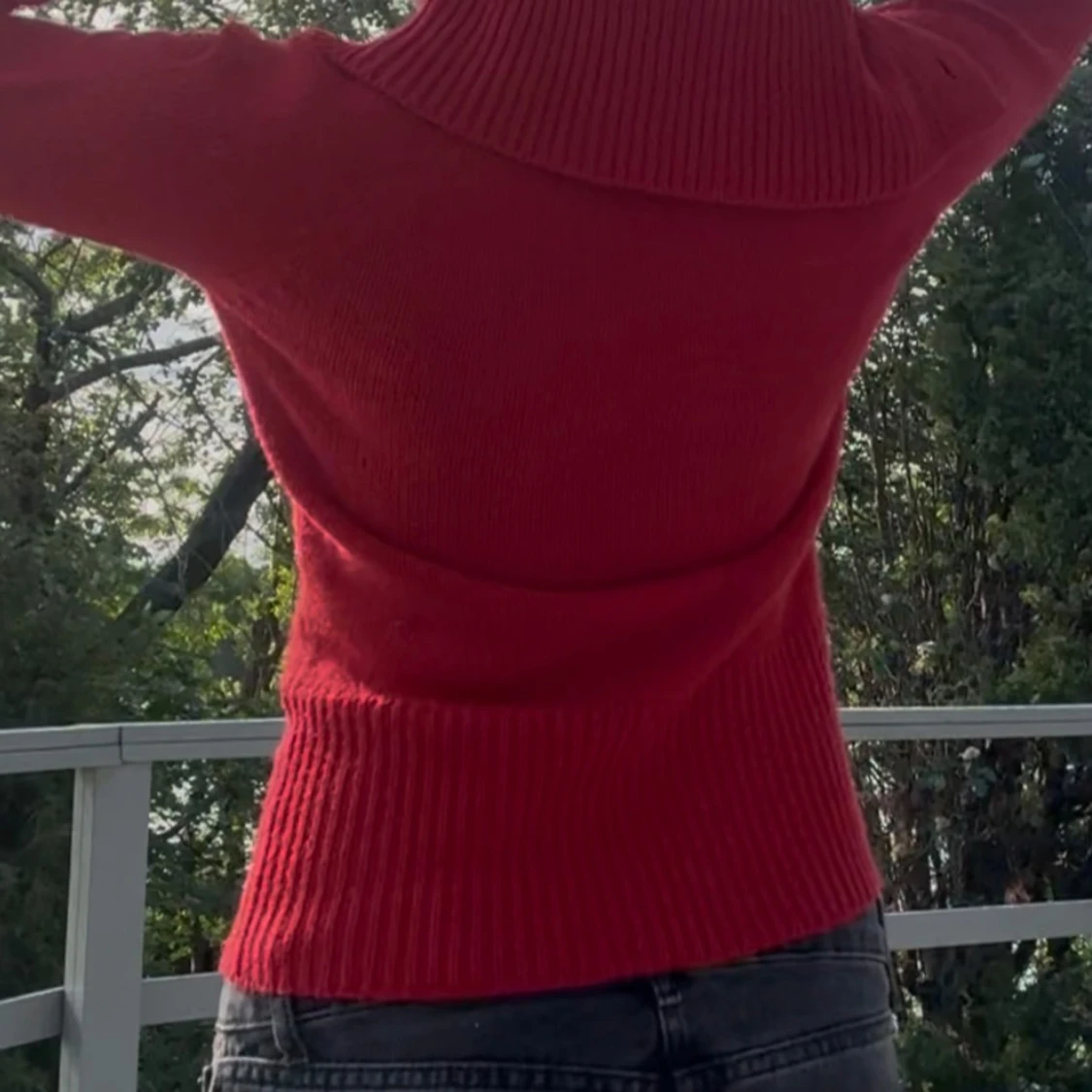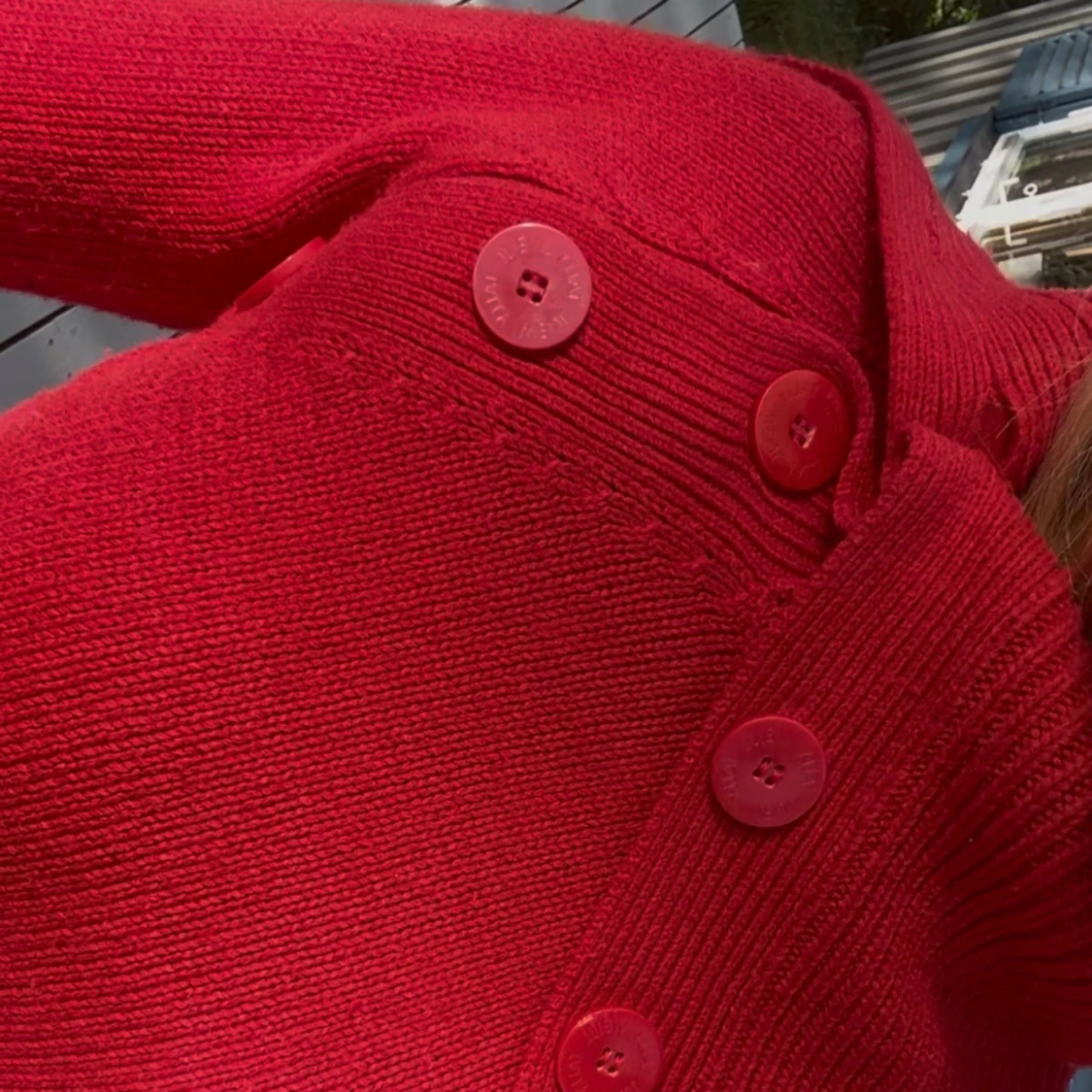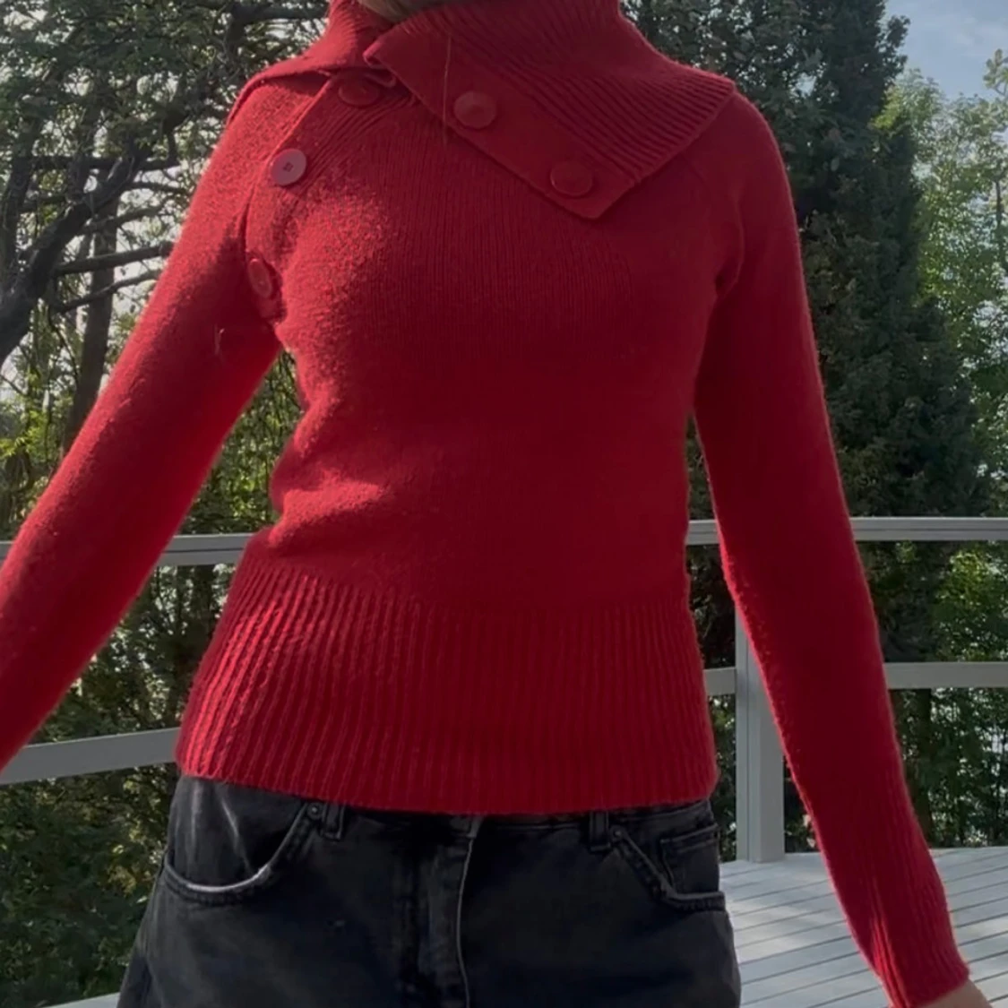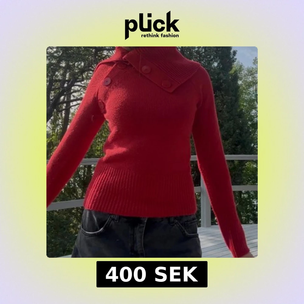 Snygg röd stickad tröja med lång ärm och cool krage med stora dekorativa knappar. Tröjan har ribbade muddar och midja för en tightare passform.