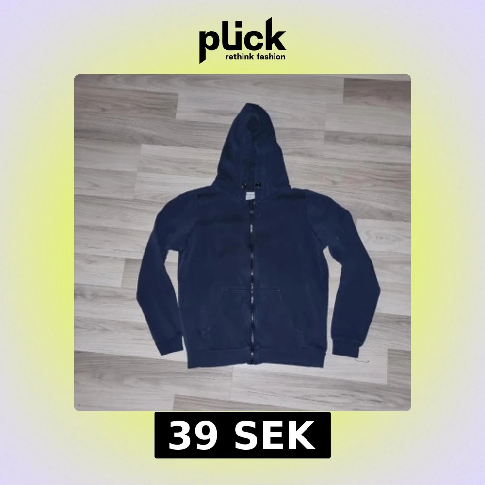 Säljer en stilren mörkblå hoodie från Stories i storlek S. Tröjan har en dragkedja framtill och en praktisk huva. Perfekt för en avslappnad look.