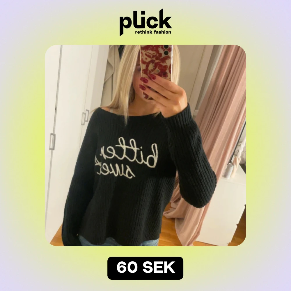 Säljer en svart stickad tröja med texten 'Bitter Sweet' i vitt på framsidan. Tröjan har en avslappnad passform och långa ärmar, perfekt för kyliga dagar. Den är både stilren och bekväm, idealisk för vardagsbruk. Passar bra till jeans eller leggings för en casual look.