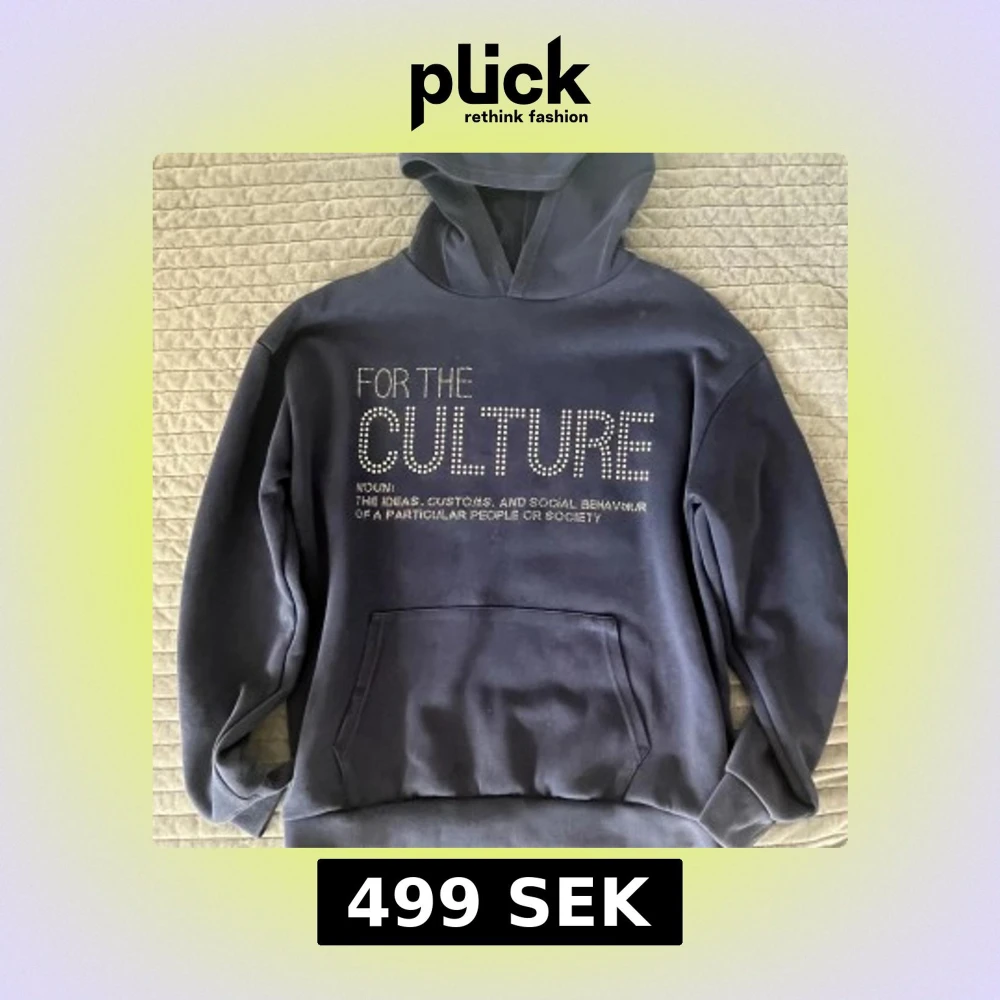 Säljer en mörkblå hoodie med texten 'FOR THE CULTURE' i stora bokstäver framtill, dekorerad med små stenar. Klassisk huva och magficka. Perfekt för en avslappnad stil. 🥹🫰🏼🐠🔵