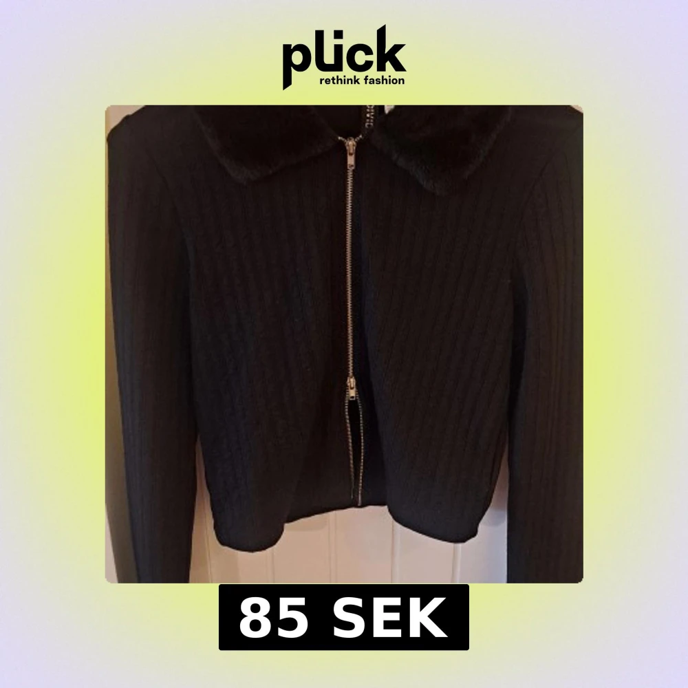 Snygg svart ribbad jacka med dragkedja och mjuk fuskpäls på kragen och ärmsluten. Dragkedja som kan öppnas även nederkant. Perfekt för kyliga dagar när du vill vara både varm och stilren.