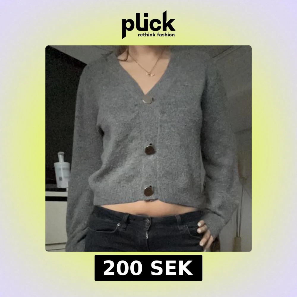 Säljer en mysig grå kofta med stora knappar framtill. Koftan har en v-ringad design och långa ärmar, perfekt för kyligare dagar. Den är croppad och ger en trendig look. Det står M på pappen men passar mig bra som har S
