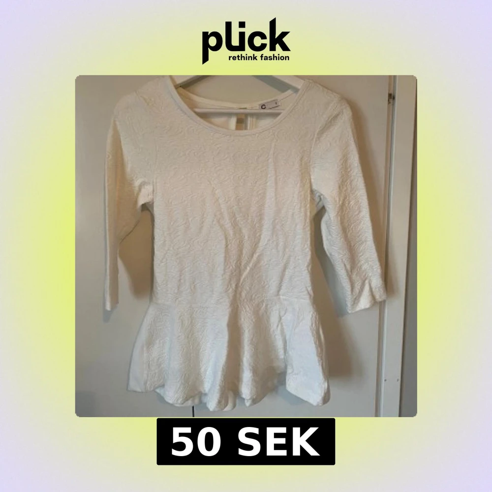 Säljer en vit peplumtop från C i storlek S. Toppen har ett snyggt strukturmönster framtill, rund halsringning och trekvartsärm. Modellen är figurnära upptill och har en volang nertill som ger en peplumeffekt. Perfekt att styla med jeans eller kjol.