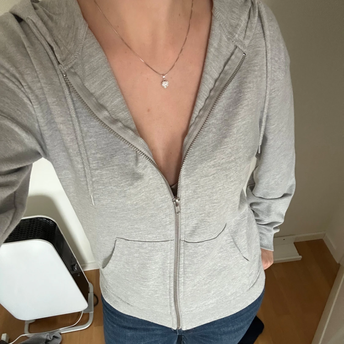 Säljer en supermysig grå zip up från Even&Odd. Den har en dragkedja framtill och en skön huva med snören. Perfekt för en chill dag eller när du vill ha något bekvämt att mysa i. Den är i bra skick och passar till det mesta i garderoben!