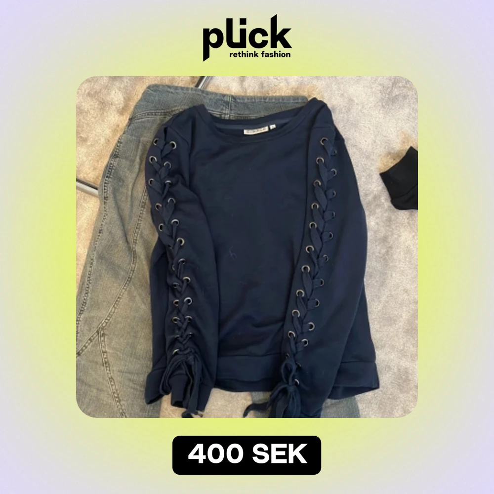 Mörkblå tunn sweatshirt med snörning på sidan. Storlek S men jag tycker den motsvarar mer än XS