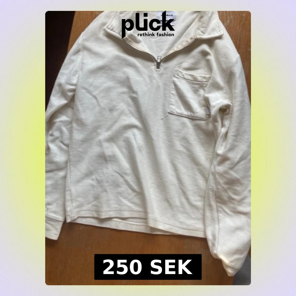 Säljer en stilren vit halvzip tröja från Woodbird i ekologisk bomull. Tröjan har en bröstficka, hög krage med dragkedja och långa ärmar. Perfekt för dig som gillar minimalistisk och clean stil.