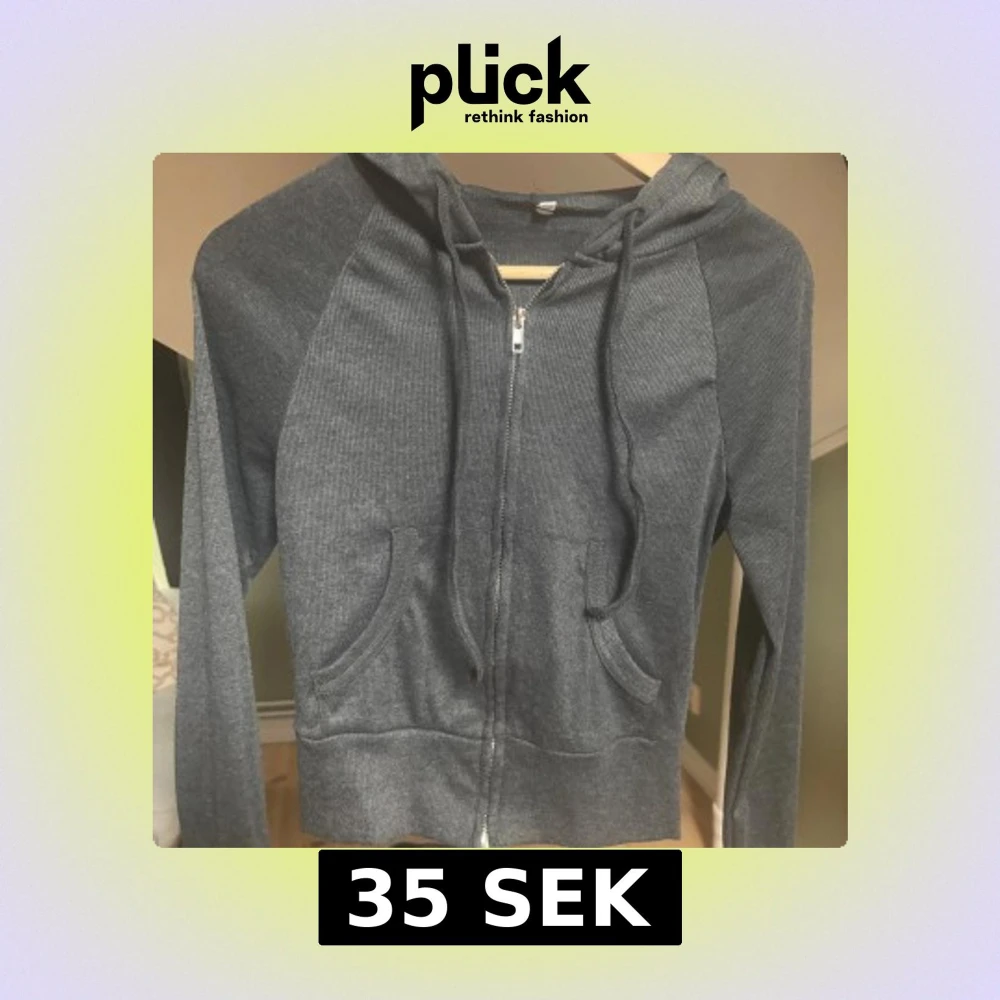 Mörkgrå hoodie med dragkedja framtill och huva med snören. Tröjan har två fickor på magen och är ribbad i materialet. Långärmad och i en croppad modell som ger en snygg och avslappnad look.
