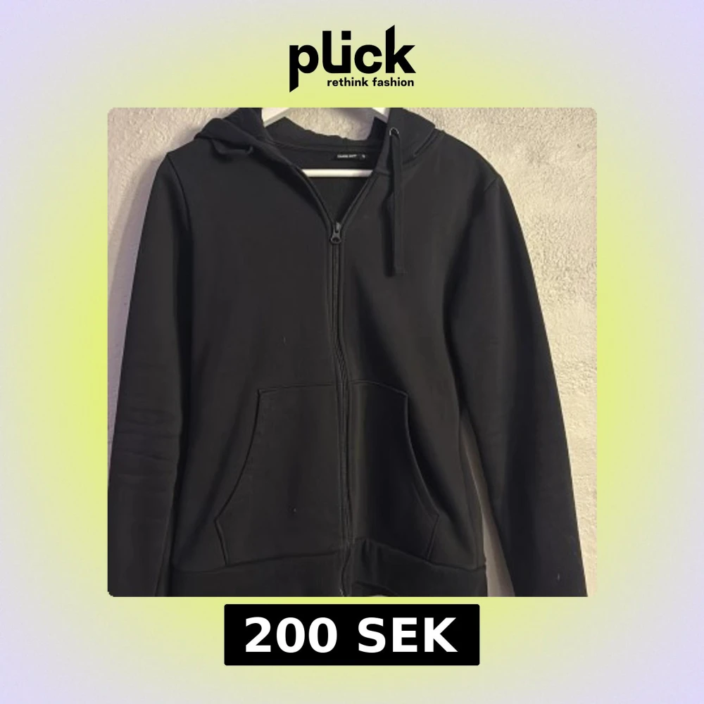 Svart hoodie från Take Off i storlek S. Tröjan har huva med snörning, hel dragkedja framtill och två stora fickor. Materialet känns mjukt och är troligen bomull eller polyester. Perfekt för chill dagar och enkel att matcha med jeans eller joggers.