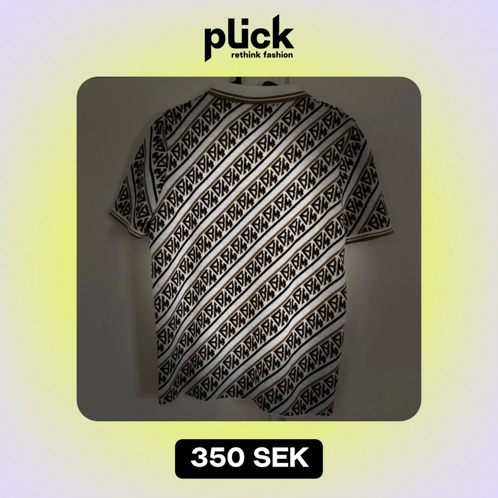 Säljer en snygg pikétröja med ett unikt diagonalt mönster i svart och beige. Tröjan har en dragkedja framtill och korta ärmar, perfekt för en stilren look. Passar både till vardags och festliga tillfällen!