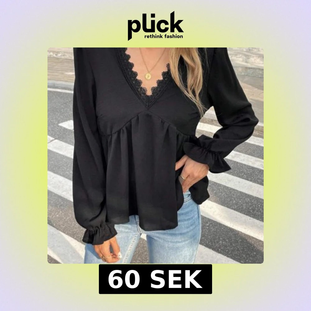 Supersnygg svart blus med v-ringning och spetsdetaljer längs halsen. Långa ärmar med volang vid ärmslut och en lös passform som gör den skön att bära. Perfekt till vardag och festliga tillfällen!