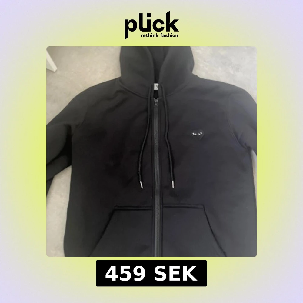 Svart hoodie från Comme des Garçons Play med dragkedja och snörning i huvan. Ikoniskt hjärta med ögon på bröstet och stort tryck på ryggen. Mjuk bomullskvalitet och praktisk känguruficka framtill. Perfekt för dig som gillar streetwear och snygga detaljer. Storlek S som även passar M
