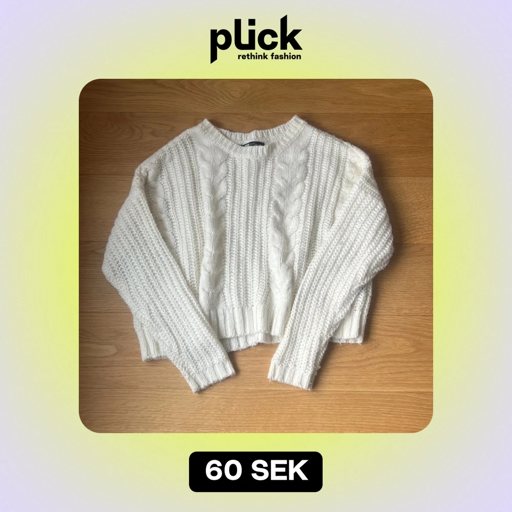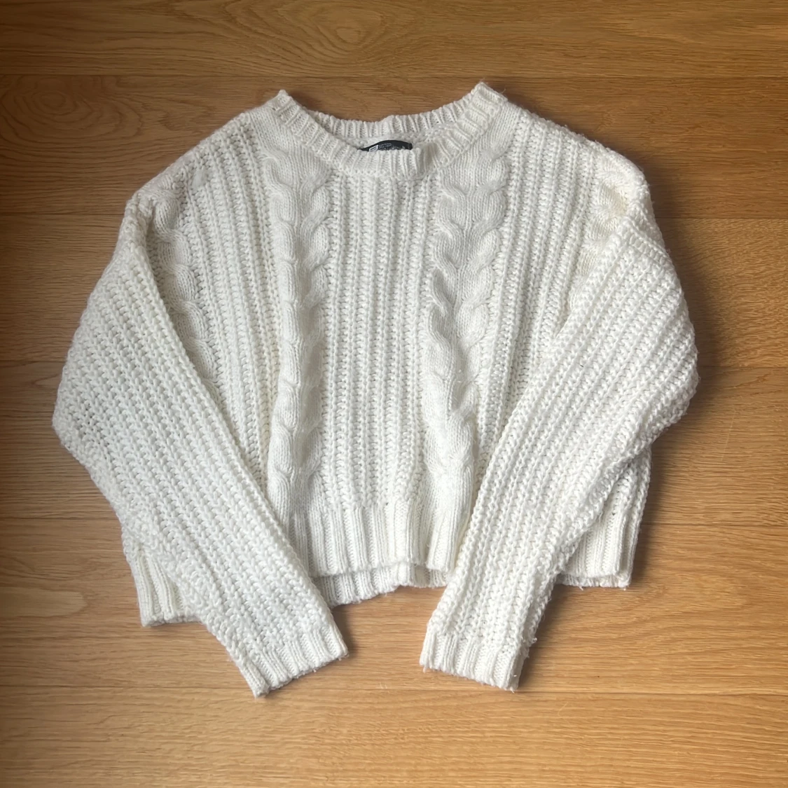 Mysig vit stickad tröja med kabelstickat mönster. Den är croppad och har långa ärmar, perfekt för kyliga dagar. Tröjan är i bra skick och passar både till vardags och lite finare tillfällen.