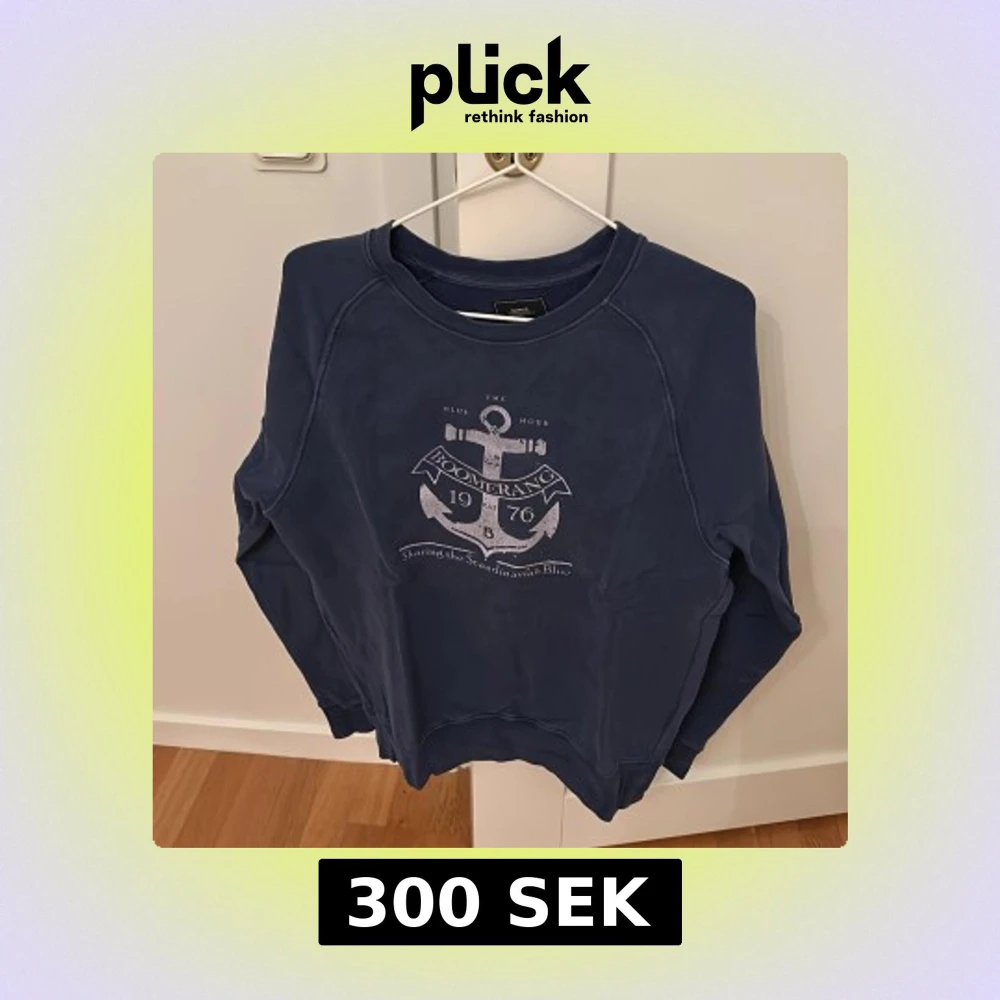 Säljer en blå tröja i ”washed” stil från Boomerang med ett tryck av ett ankare och texten 'Boomerang 1976'. Tröjan har långa ärmar och rund halsringning. Perfekt för en avslappnad stil.