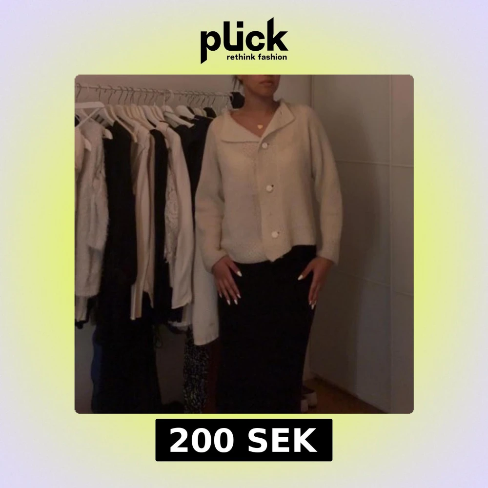 Mysig beige stickad kofta med stora vita knappar. Perfekt för kyliga dagar med sin avslappnade passform och långa ärmar. En stilren och enkel design som passar till det mesta.