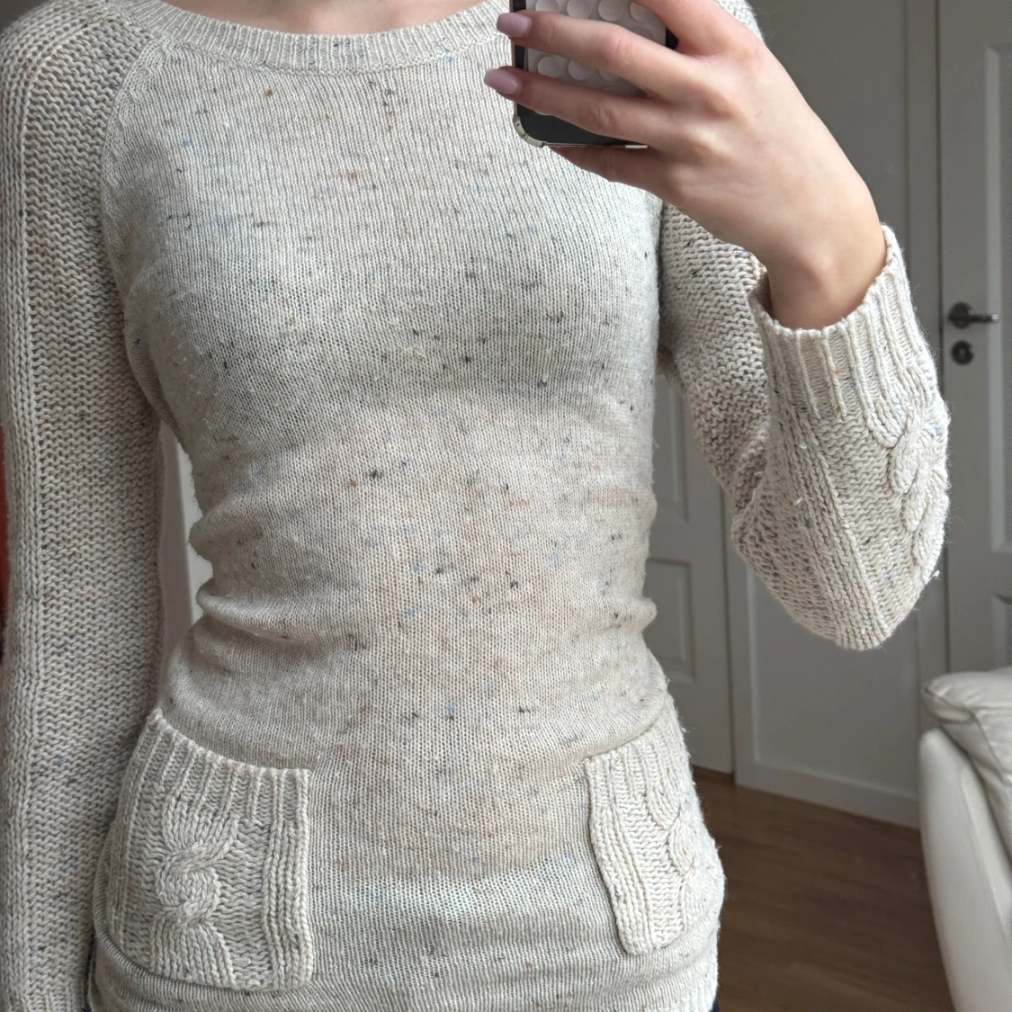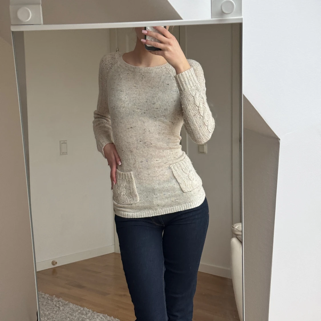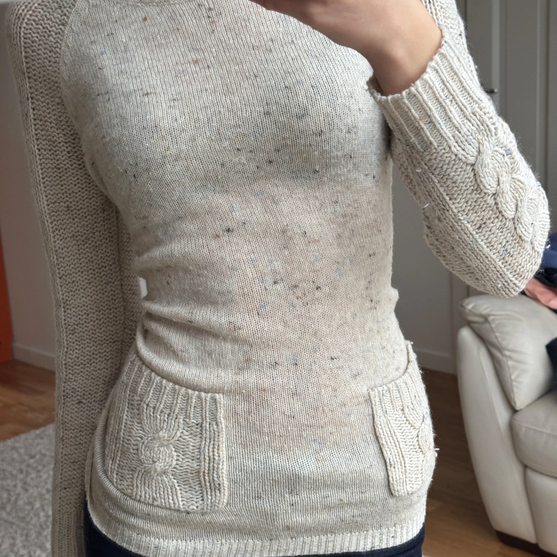 Säljer en mysig beige stickad tröja med kabelstickade detaljer och praktiska fickor framtill. Tröjan har långa ärmar och en rund halsringning, perfekt för kyligare dagar. Passar bra till jeans eller kjol för en avslappnad look.