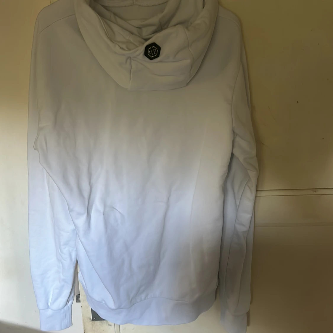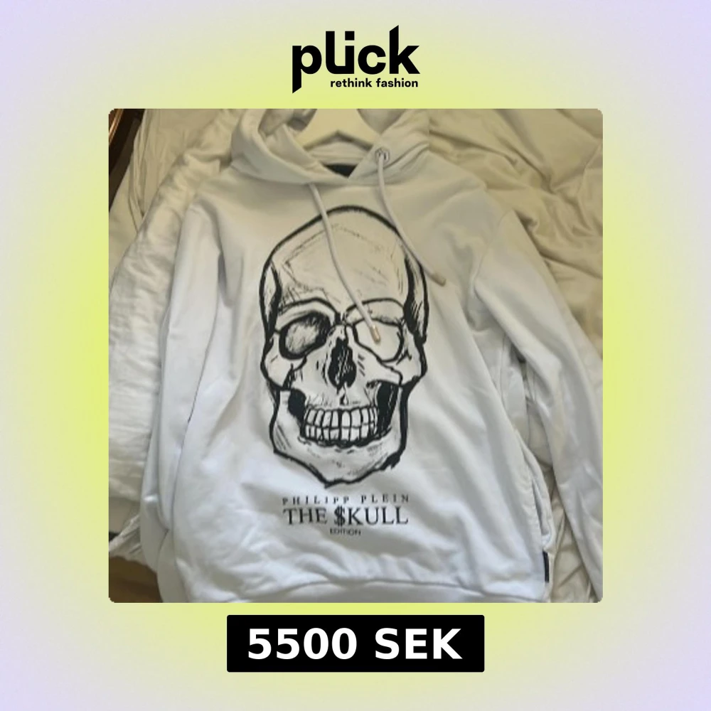 Säljer en vit hoodie från Philipp Plein med stor svart döskalle-tryck på framsidan och texten THE $KULL Edition. Hoodien har snörning i huvan, långa ärmar och en mjuk känsla. Perfekt för dig som gillar edgy streetwear och vill sticka ut. Den passar M också