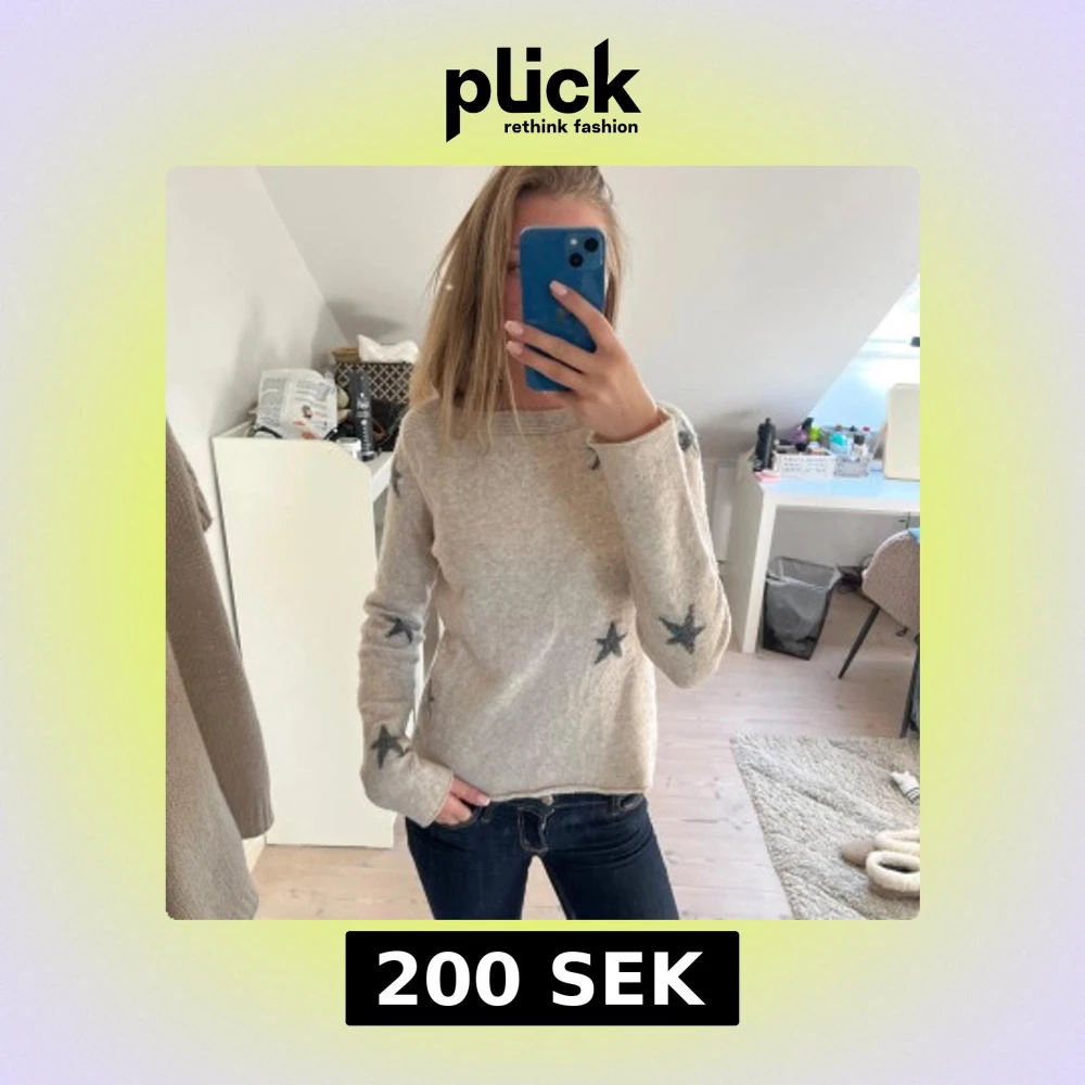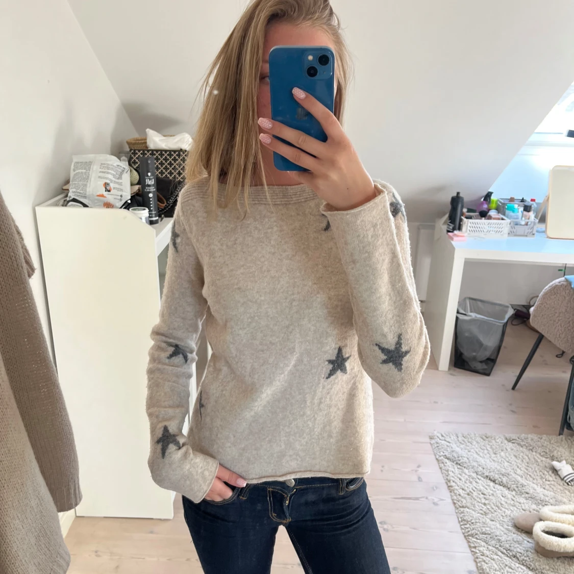 Mysig beige stickad tröja med gråa stjärnor som detalj på ärmar och framstycke. Tröjan har rund halsringning och långa ärmar. Perfekt för en avslappnad och stilren look.