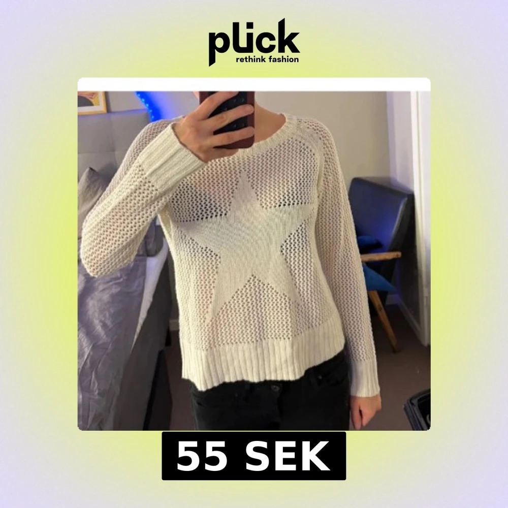 Säljer en vit stickad tröja med ett stort stjärnmönster framtill. Tröjan har lång ärm, rund halsringning och är lätt genombruten i materialet vilket ger en luftig känsla. Perfekt för lager-på-lager-stil.