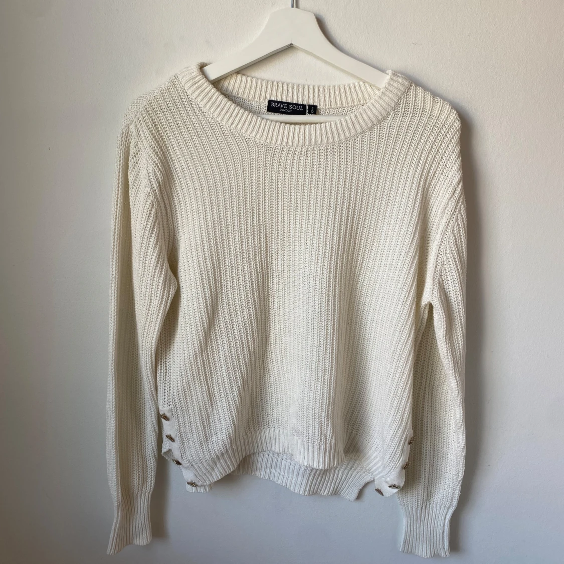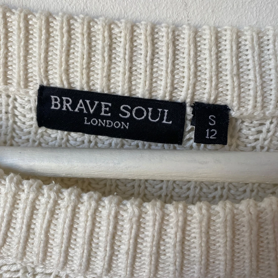 Säljer en stilren vit stickad tröja från Brave Soul. Tröjan har en rund halsringning och långa ärmar, perfekt för kyligare dagar. Den ribbade strukturen ger en klassisk look.