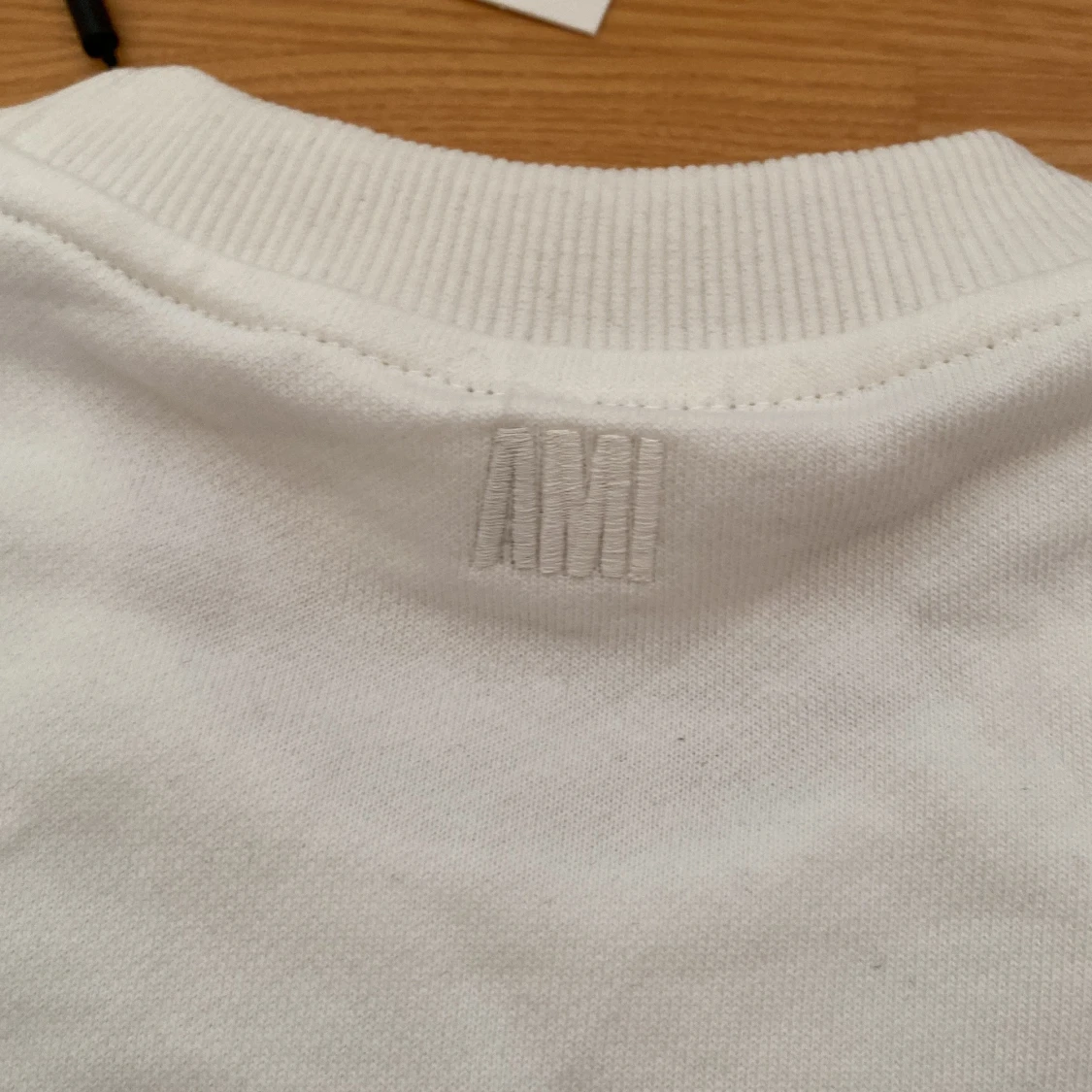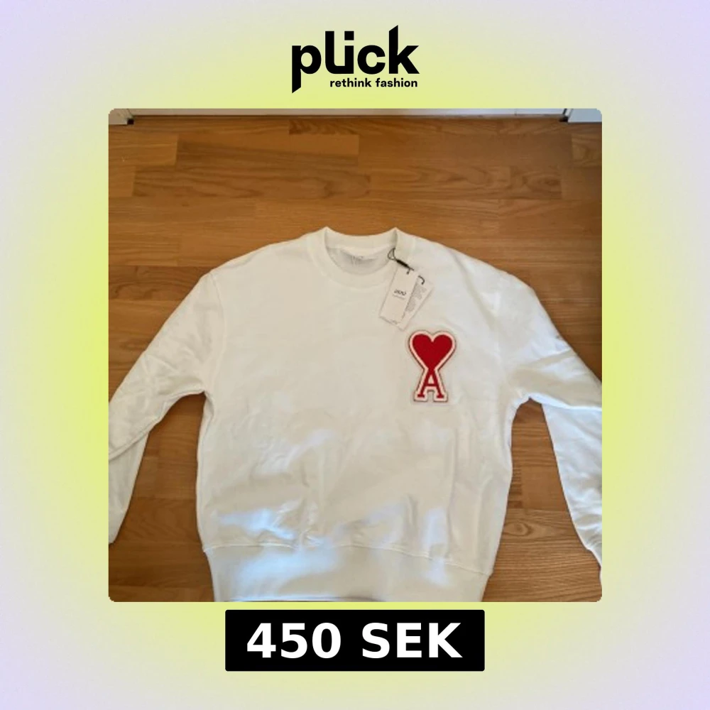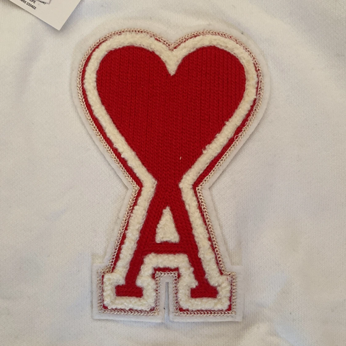 Säljer en stilren vit sweatshirt från AMI med ett stort rött hjärta och bokstaven A på bröstet. Tröjan har en rund halsringning och långa ärmar. Perfekt för en avslappnad och trendig look. Tröjan är i storlek S men passar också M