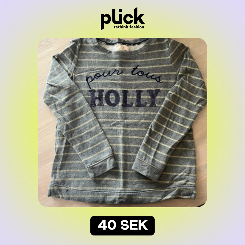 Använd men i fint skick. Grå tröja med guldiga ränder och blå text på framsidan.