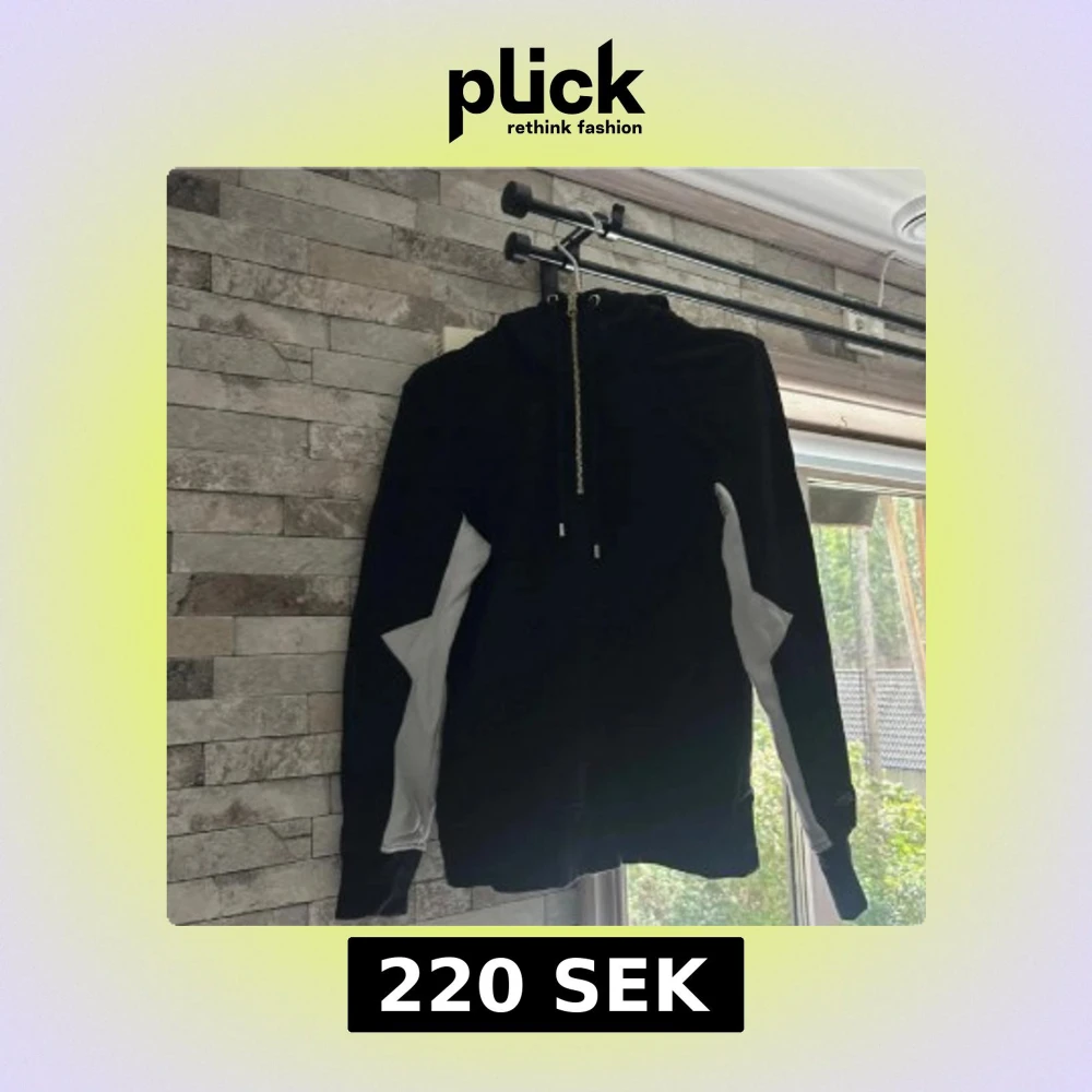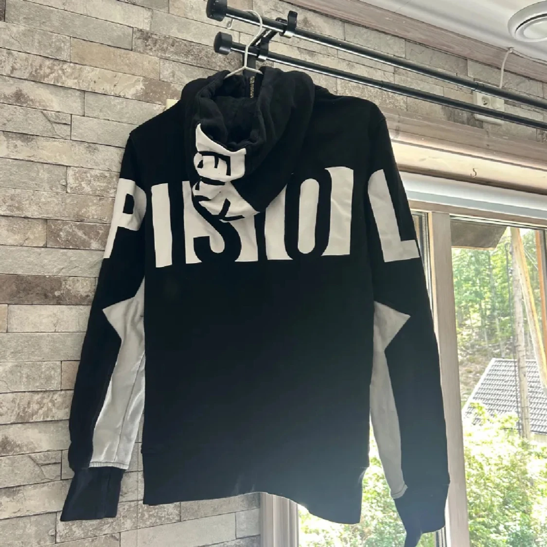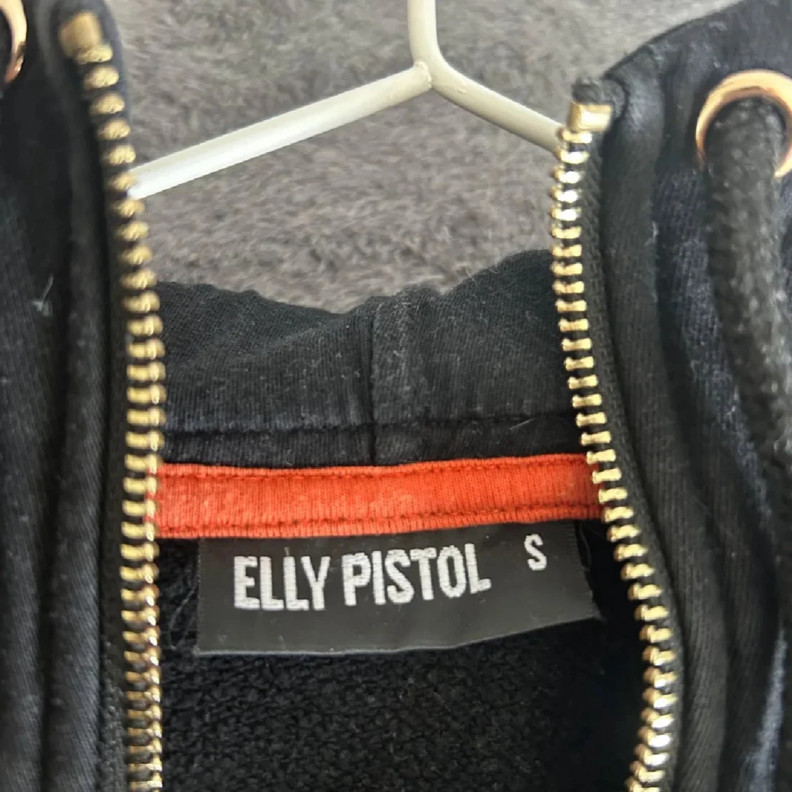 Säljer en svart hoodie från Elly Pistol i storlek S. Tröjan har vita detaljer längs ärmarna och stor vit logga på ryggen. Utrustad med huva, snörning och en snygg guldig half zip-dragkedja framtill. Perfekt för dig som gillar streetstyle och vill sticka ut.