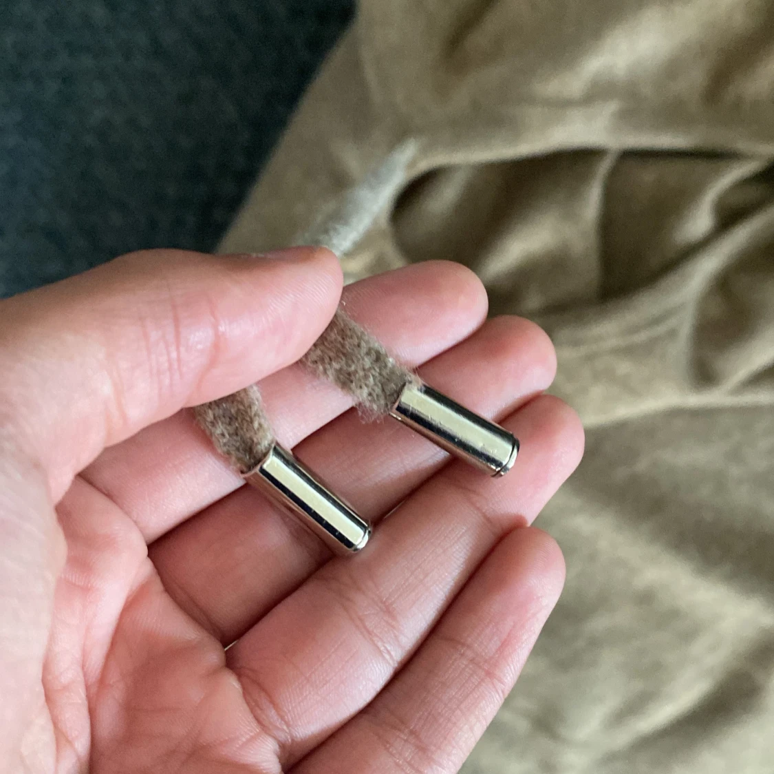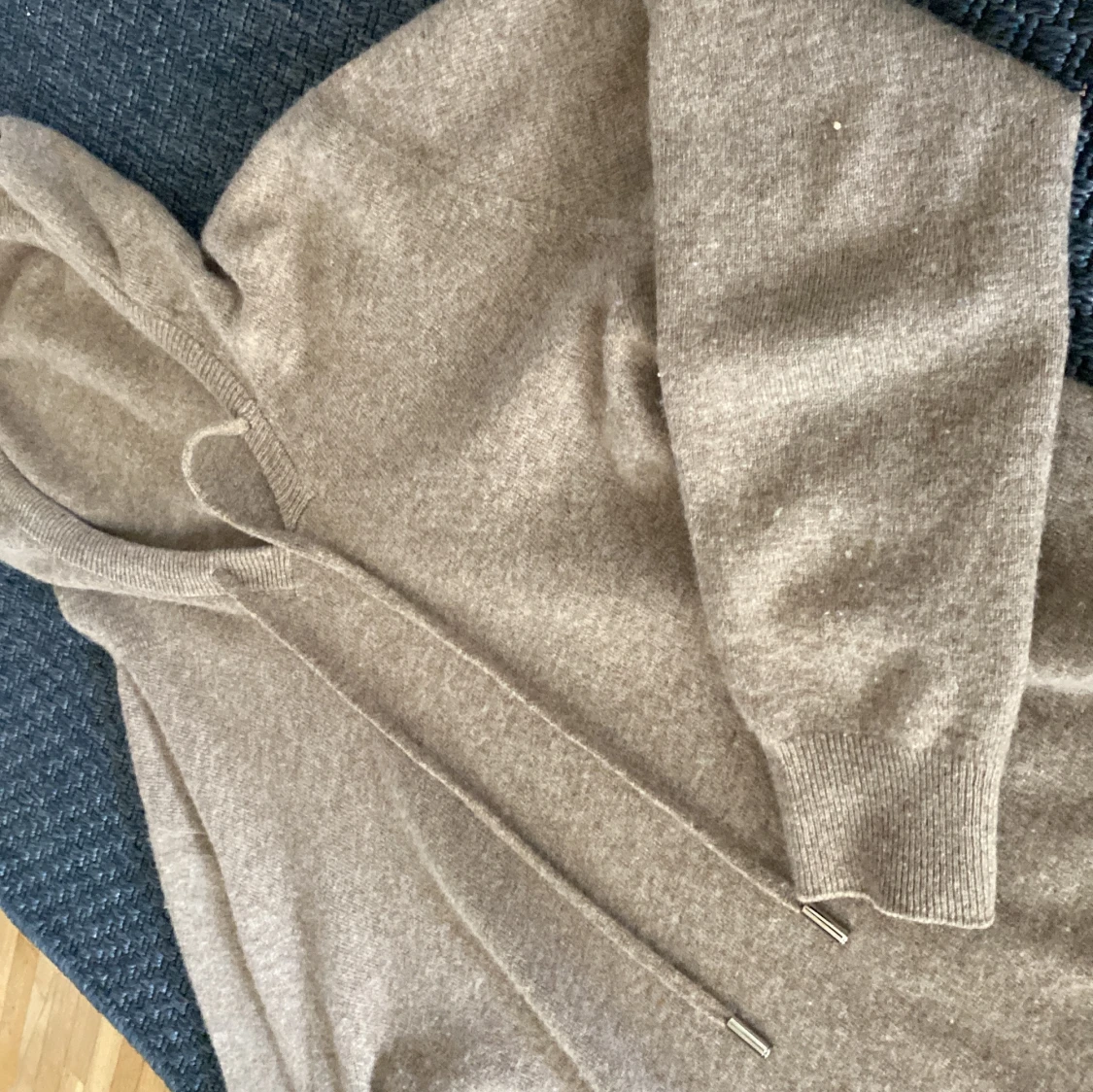 Mysig beige hoodie i stickat material med huva och långa ärmar. Tröjan har snörning med silvriga detaljer i ändarna och ribbade muddar vid ärmslut och nederkant. Perfekt för dig som gillar en chill och stilren look.