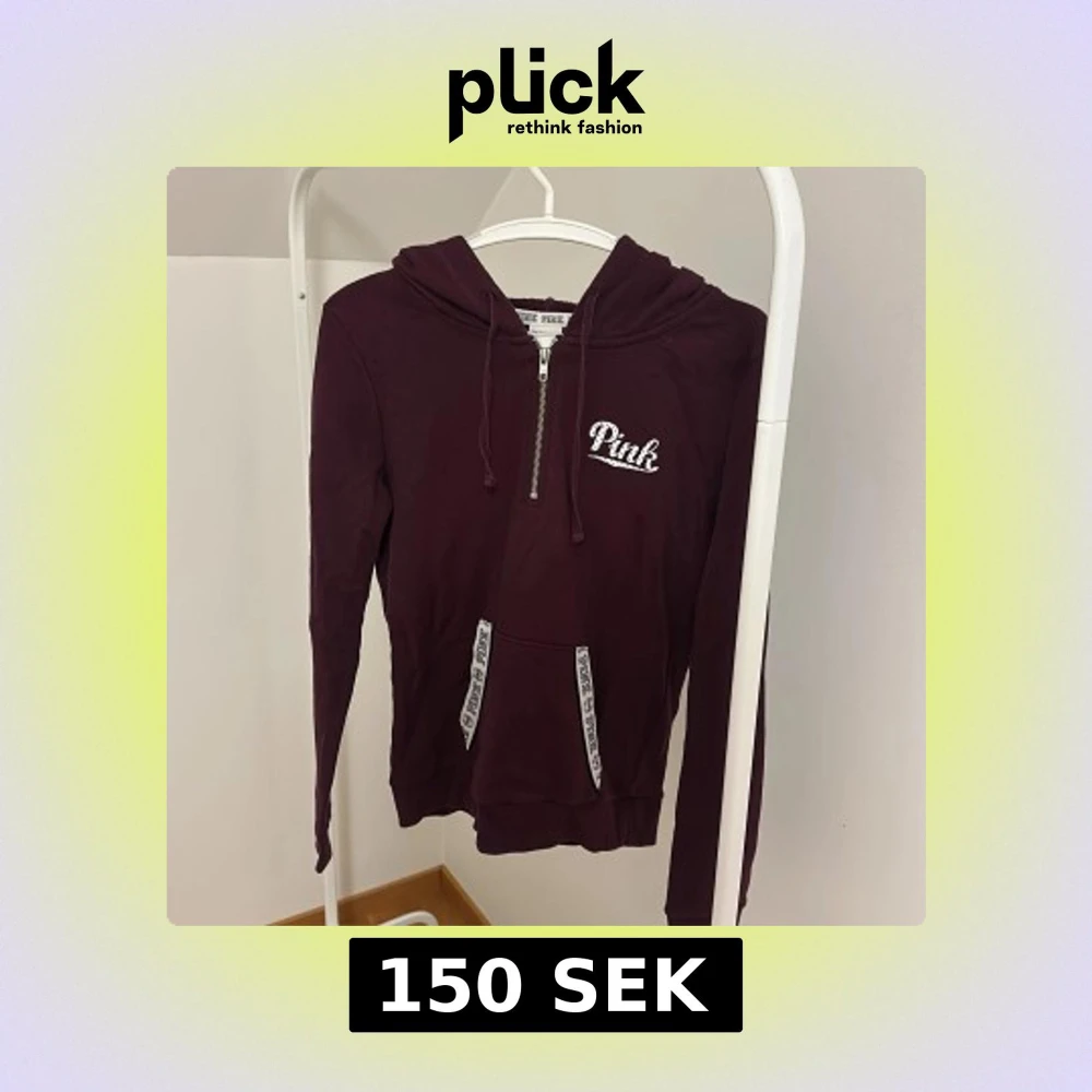 Säljer en vinröd hoodie från Victoria's Secret Pink med dragkedja och huva. Tröjan har långa ärmar och en praktisk ficka framtill. Perfekt för en avslappnad stil. 💜