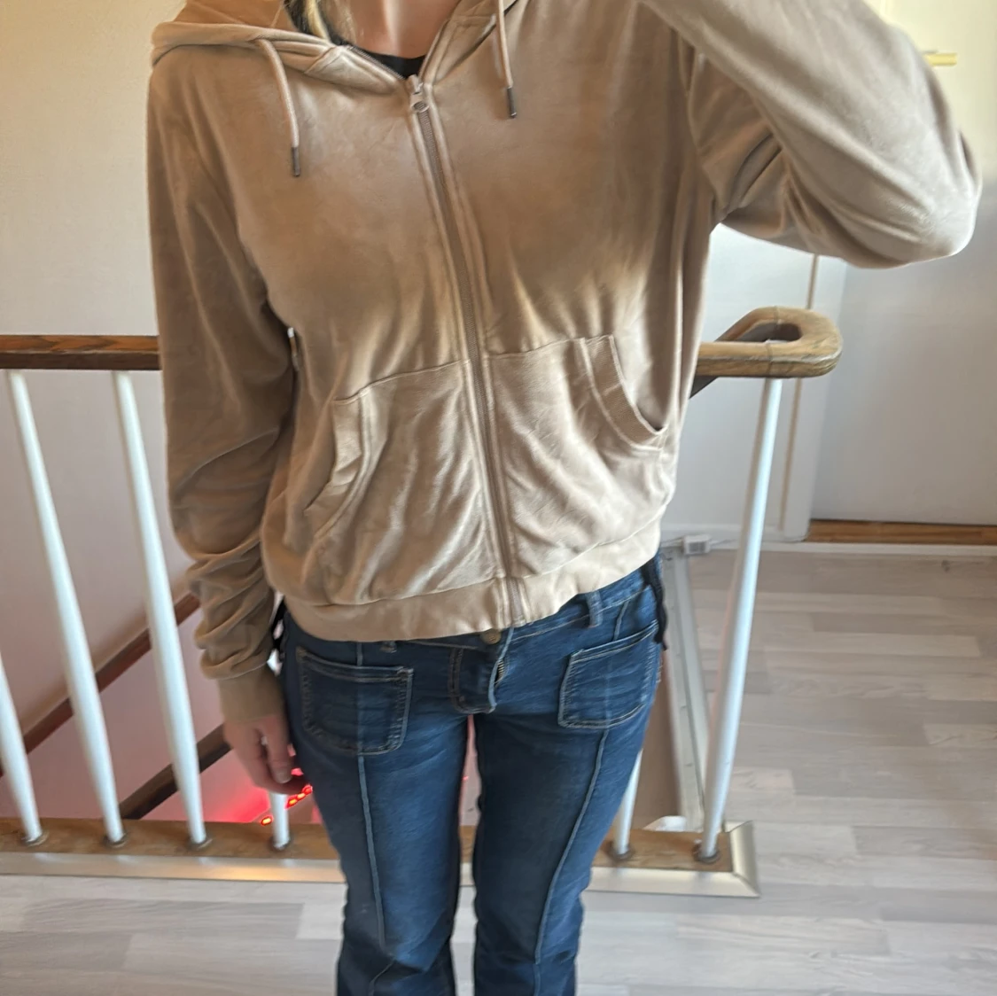 Beige velour hoodie med dragkedja