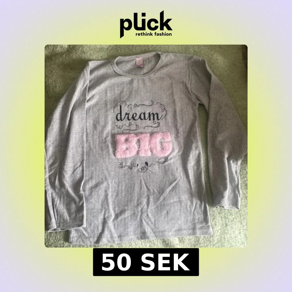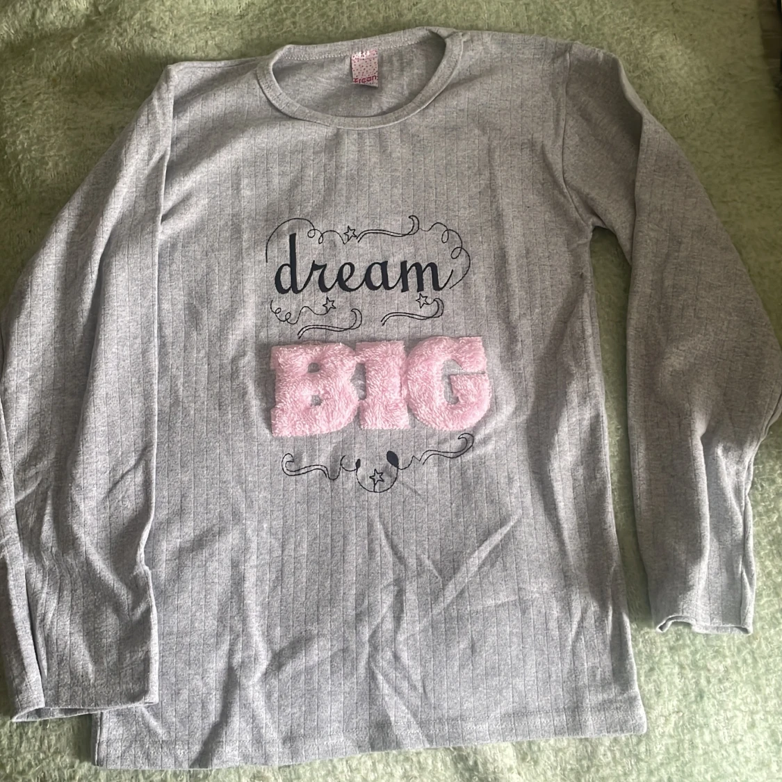 Grå långärmad tröja från Ercan med texten 'dream BIG' framtill. Ordet 'BIG' är i fluffigt rosa material som sticker ut. Tröjan har rund halsringning och är perfekt för dig som gillar bekväma och snygga basplagg med en twist. Matchar med byxorna jag har lagt upp