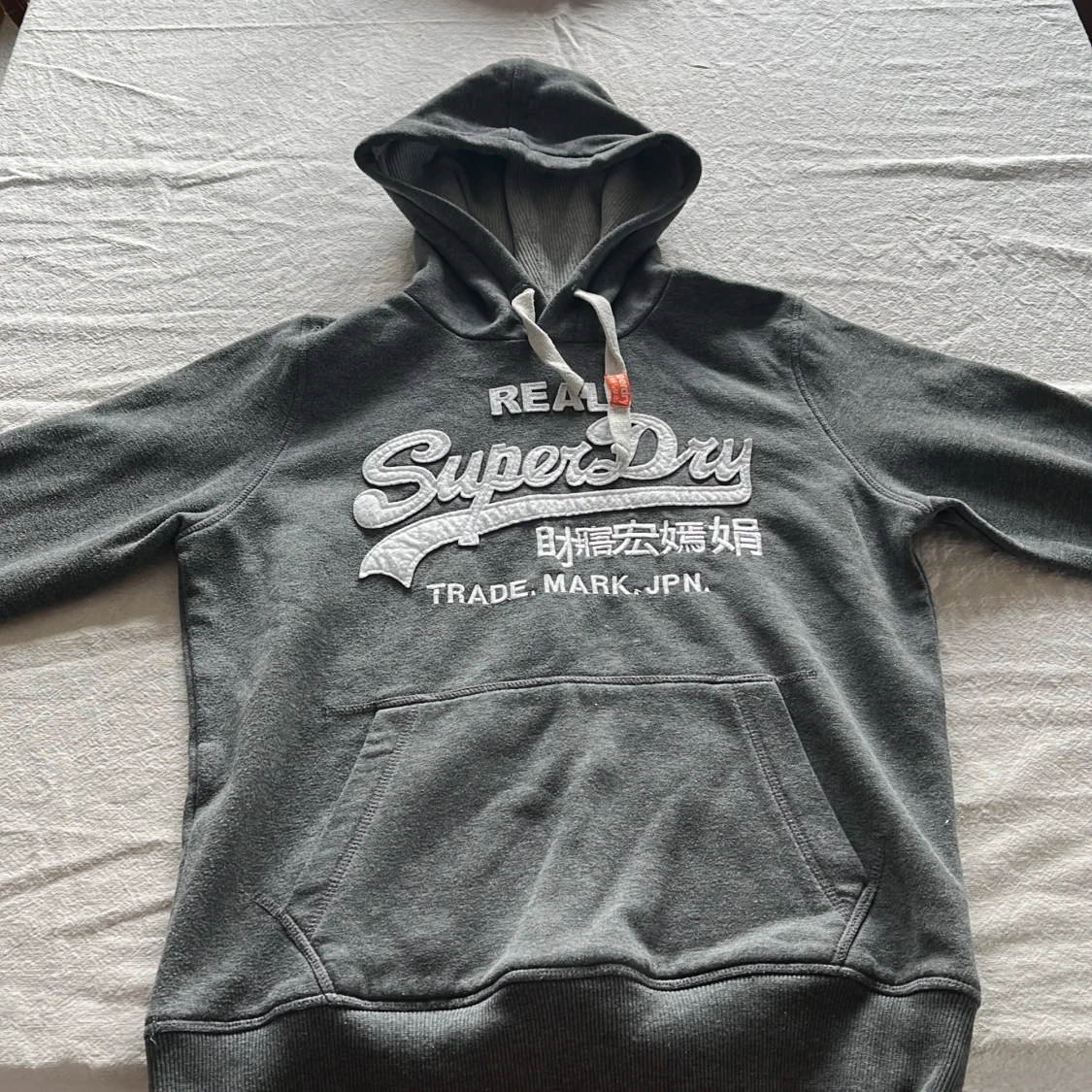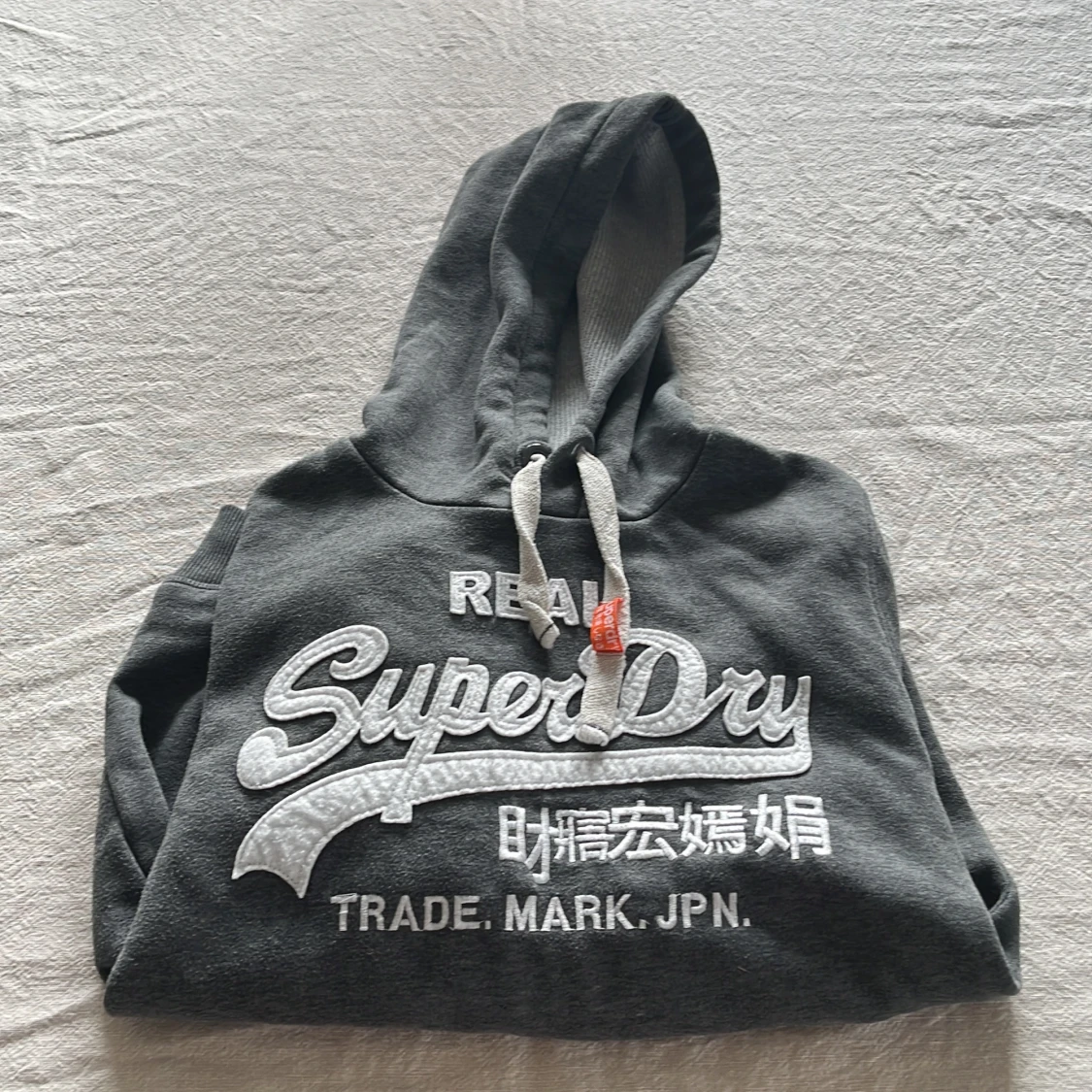 Snygg mörkgrå hoodie från Superdry med stort vitt broderat logotyp-tryck och japanska tecken på bröstet. Tröjan har huva med snörning, känguruficka och ribbade muddar. Perfekt för chill dagar eller när du vill ha en casual streetstyle. Vid armen har den en logotyp vilket gör den ännu fetare.