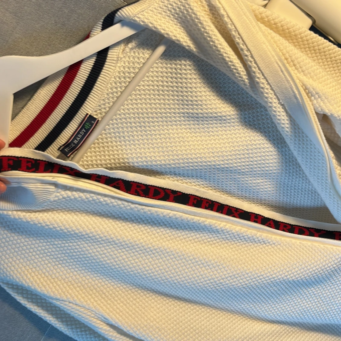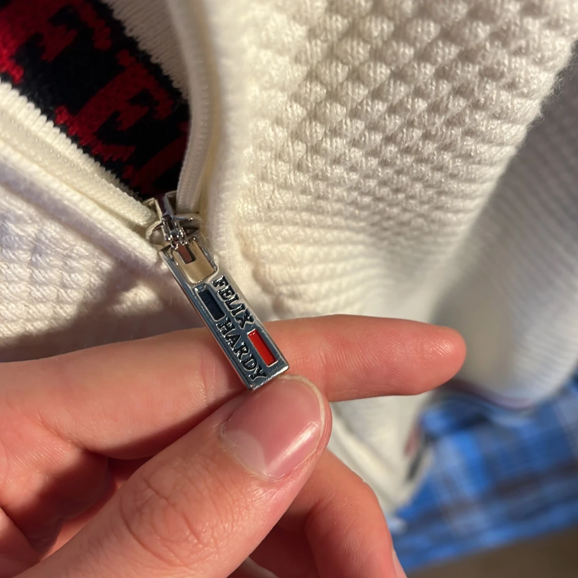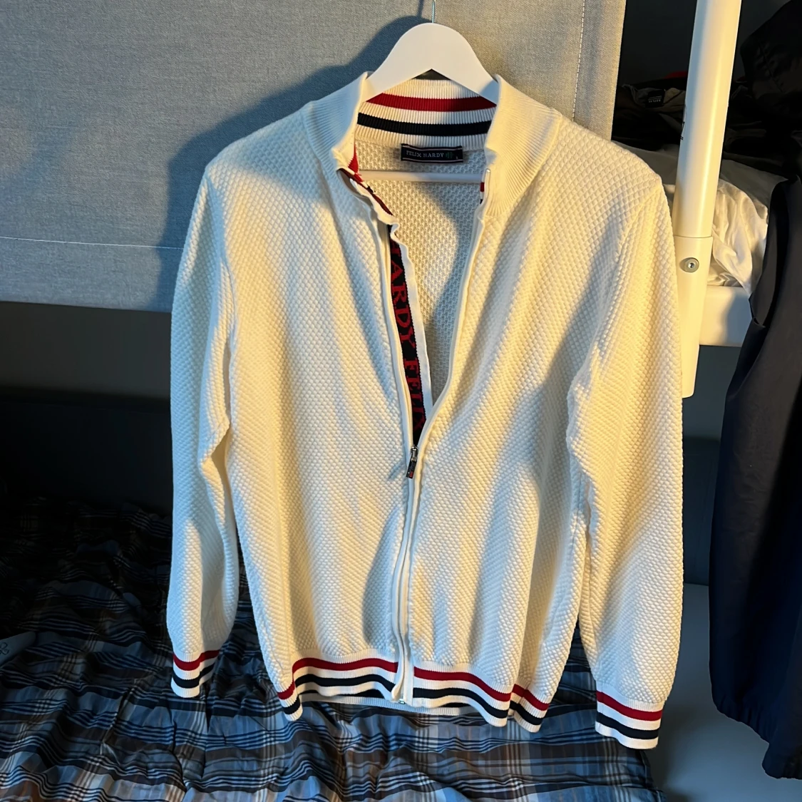 Snygg vit cardigan jacka från Felix Hardy med strukturstickat tyg, dragkedja framtill och ribbade muddar med röd, blå och vit rand. Jackan har lång ärm och detaljer med logga längs dragkedjan. Perfekt för dig som gillar stilren look.