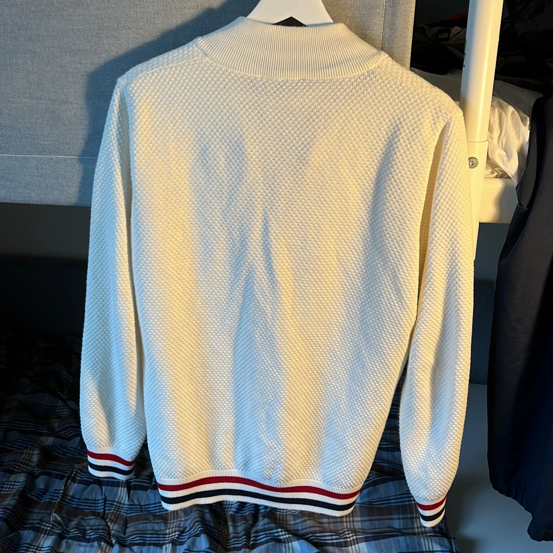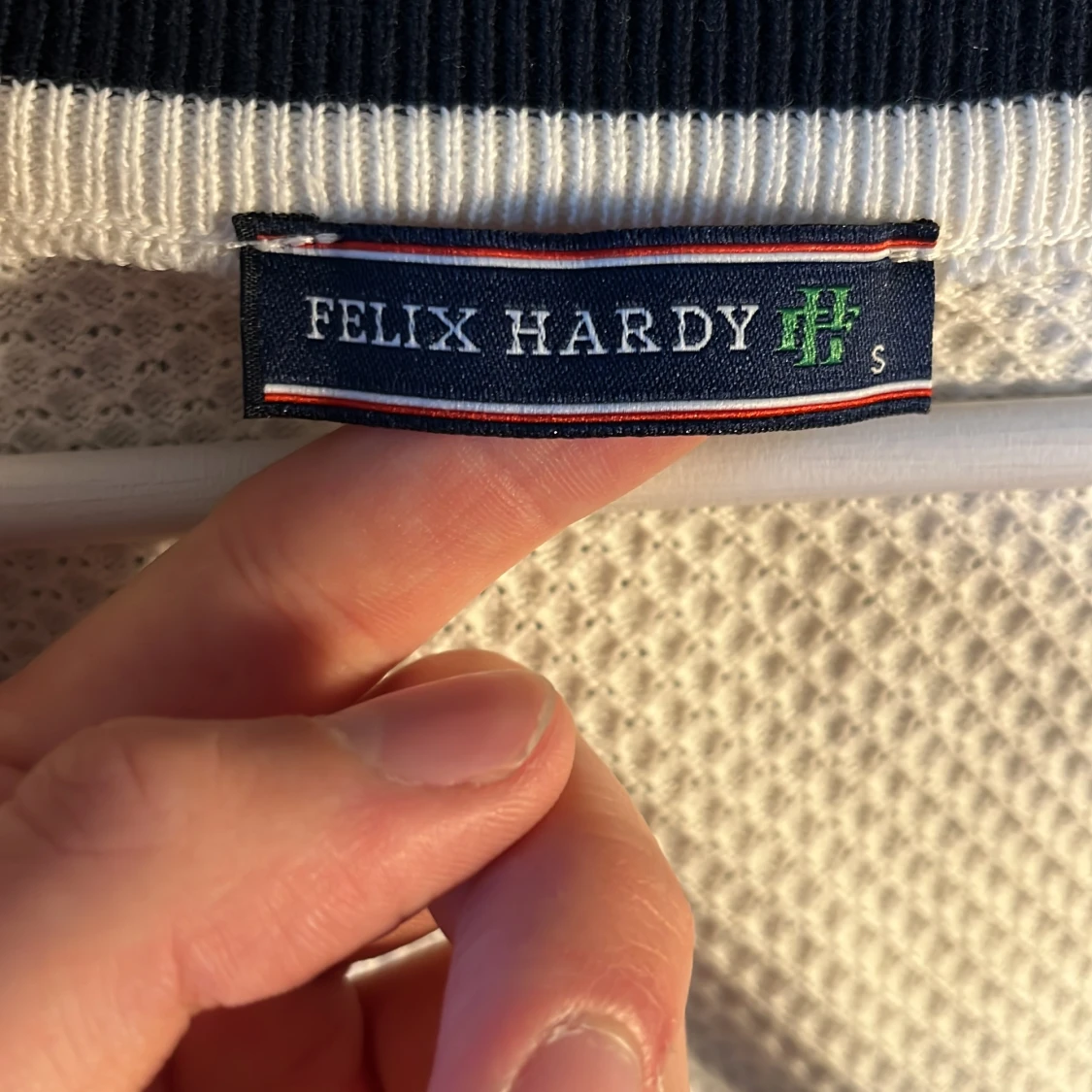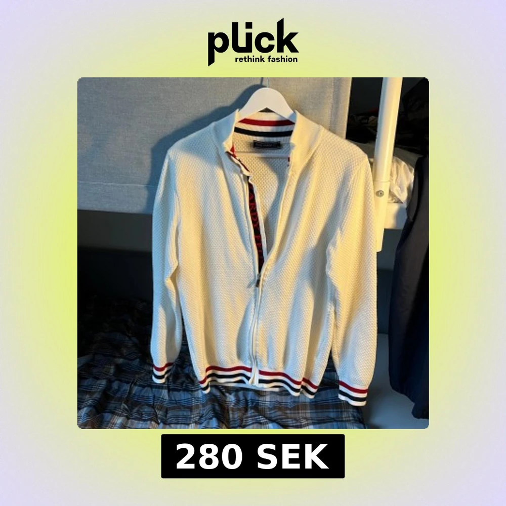 Snygg vit cardigan jacka från Felix Hardy med strukturstickat tyg, dragkedja framtill och ribbade muddar med röd, blå och vit rand. Jackan har lång ärm och detaljer med logga längs dragkedjan. Perfekt för dig som gillar stilren look.