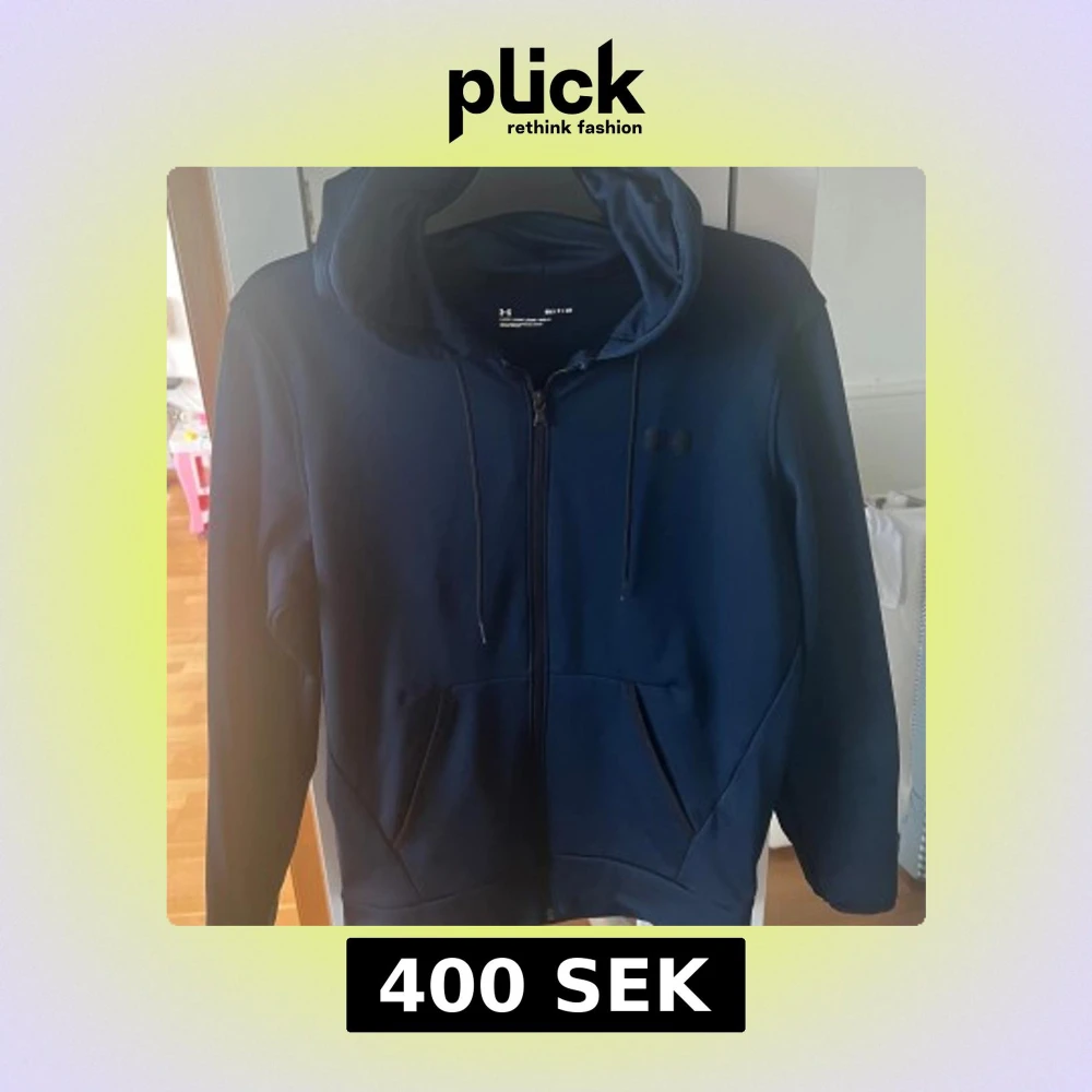 Säljer en mörkblå hoodie från Under Armour med dragkedja framtill och huva med snörning. Tröjan har två stora fickor och är perfekt för träning eller chill. Klassisk och stilren design med diskret logga på bröstet.