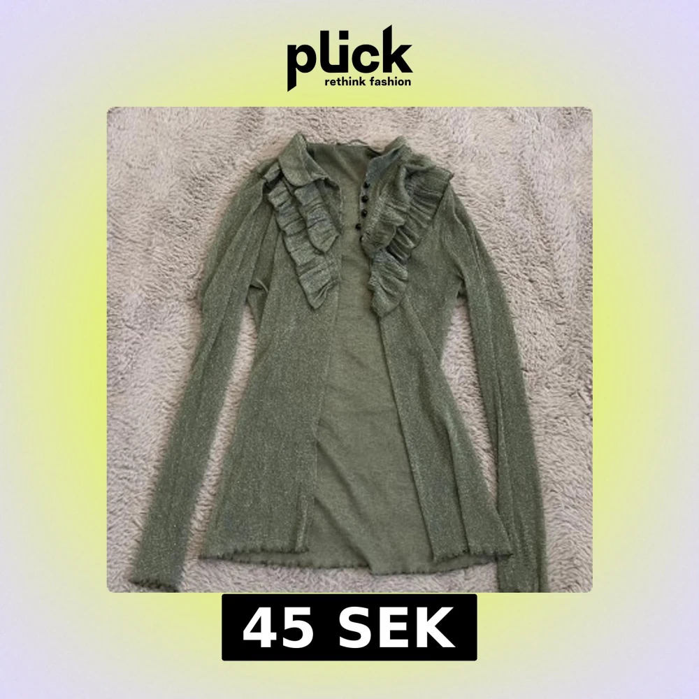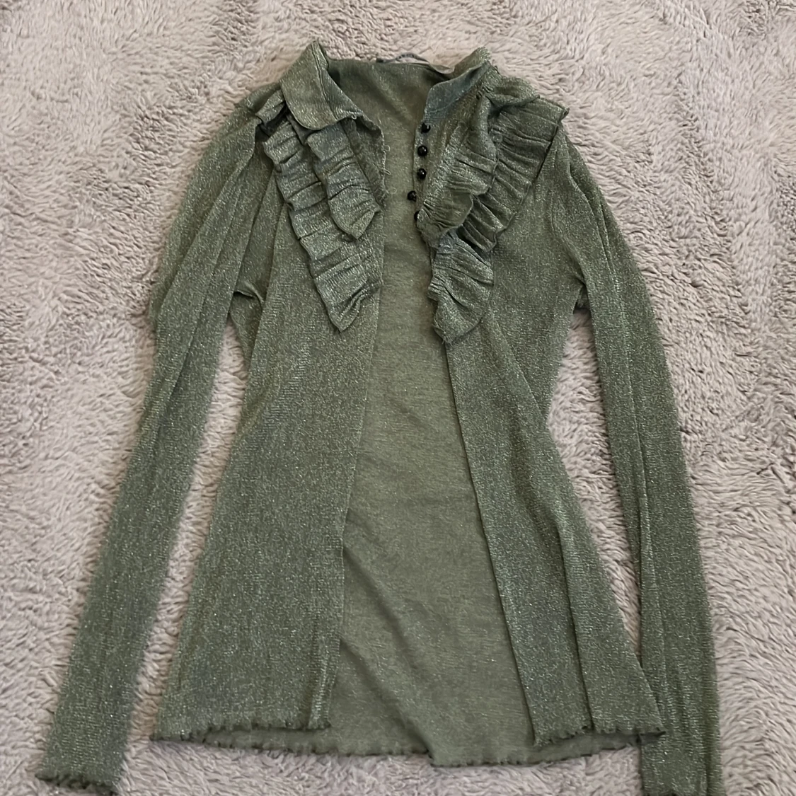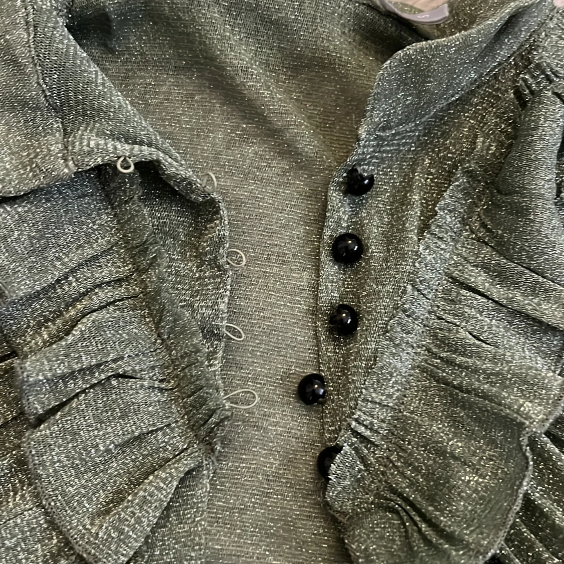 Supersnygg glittrig grön kofta från Ofelia i storlek S. Koftan har långa ärmar, volangdetaljer längs framstycket och svarta knappar. Materialet är tunt och transparent med en skimrande finish som ger extra wow-effekt. Perfekt för dig som gillar att sticka ut!