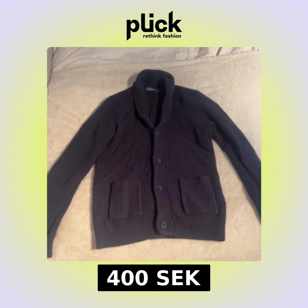 Säljer en mörkblå stickad kofta med grov ribbad struktur och stora framfickor. Koftan har en bred krage och stängs med fem knappar framtill. Perfekt för dig som gillar klassisk stil med lite extra edge.