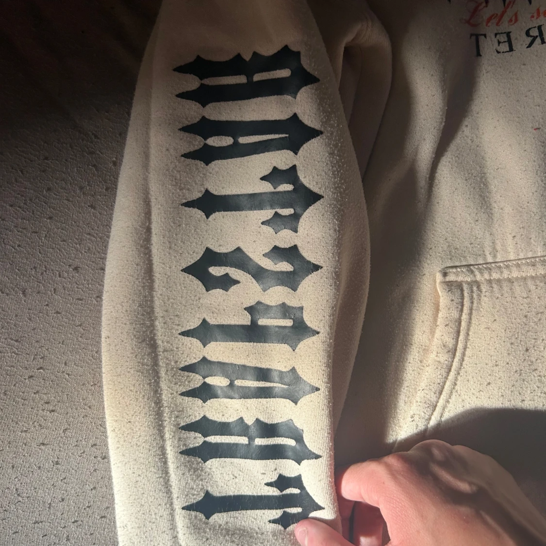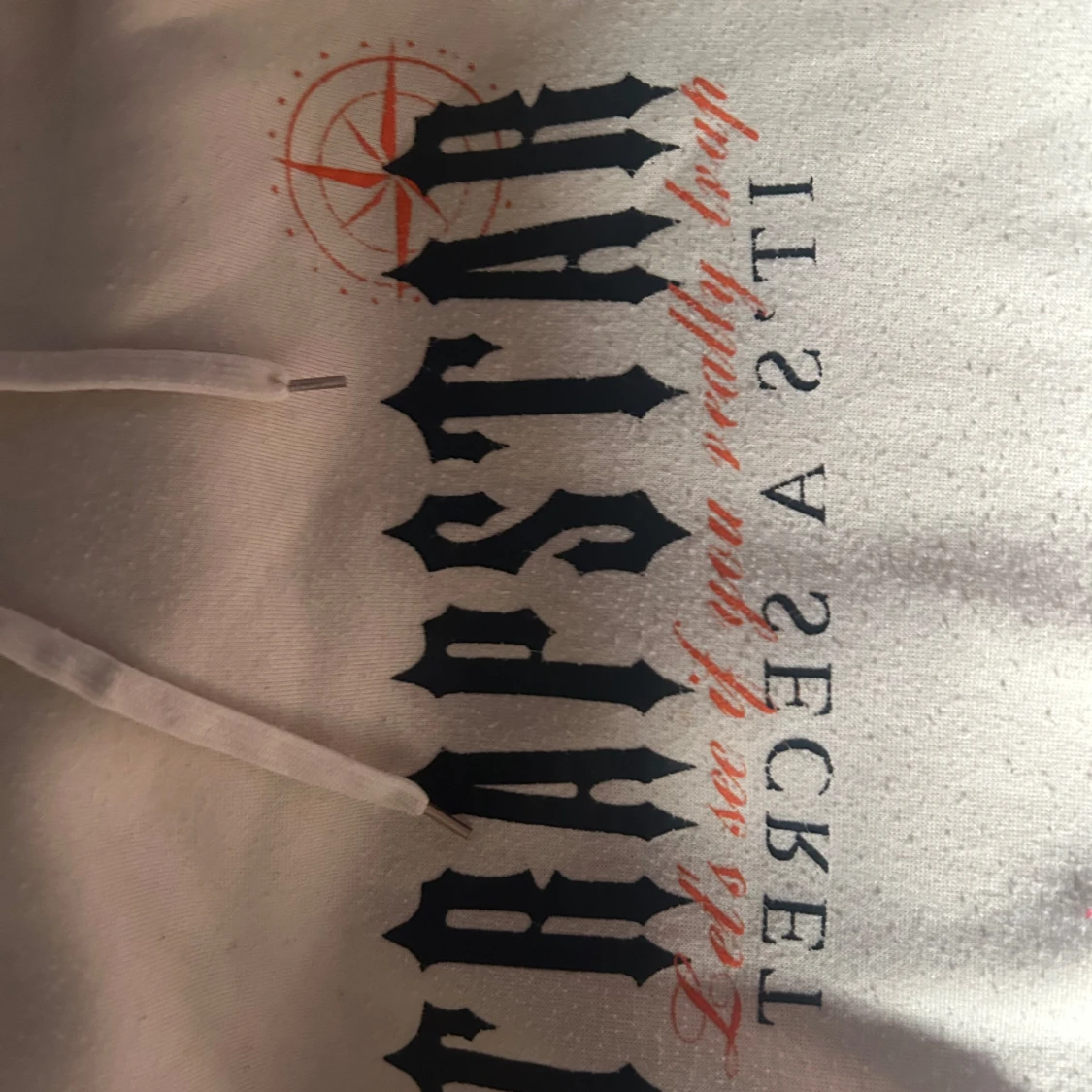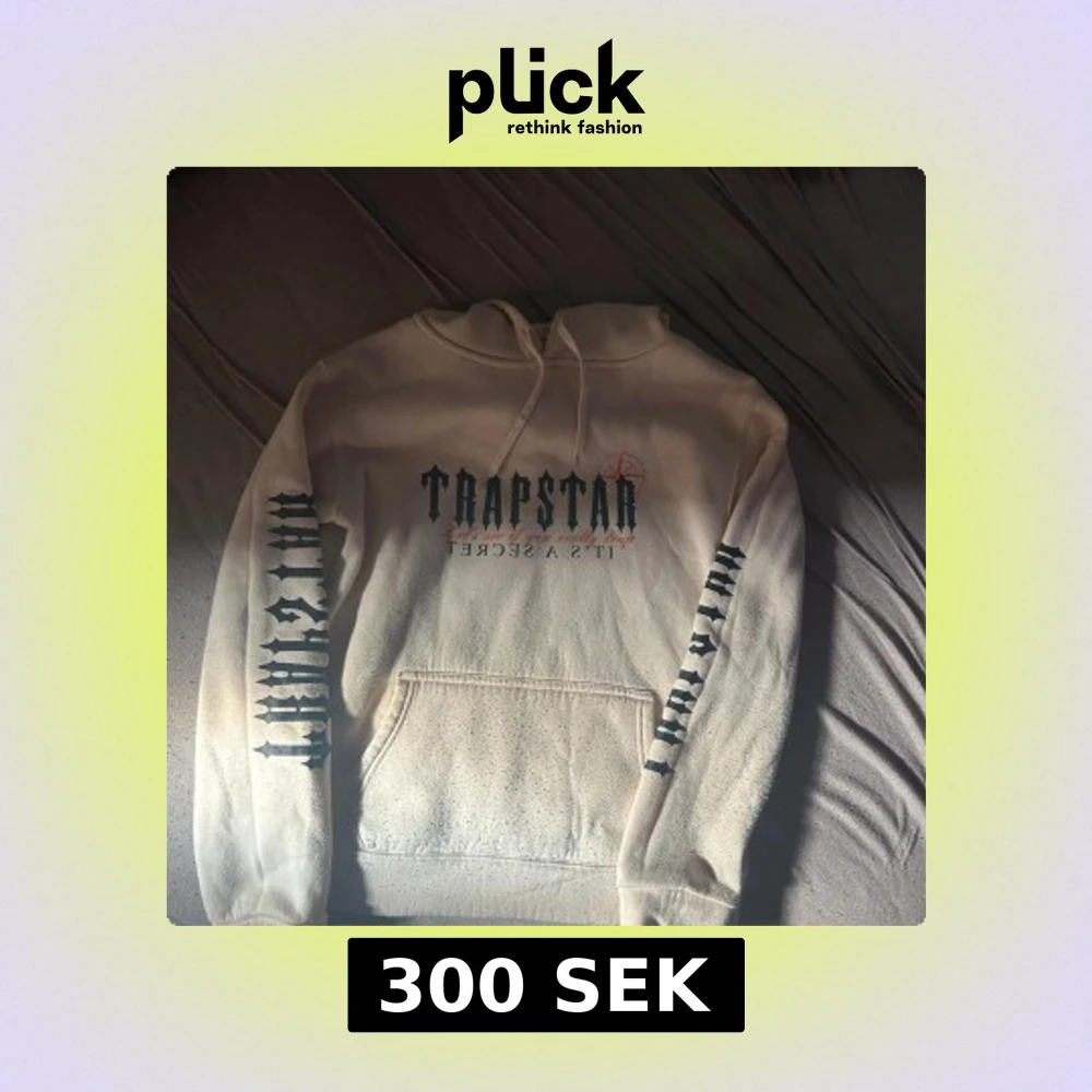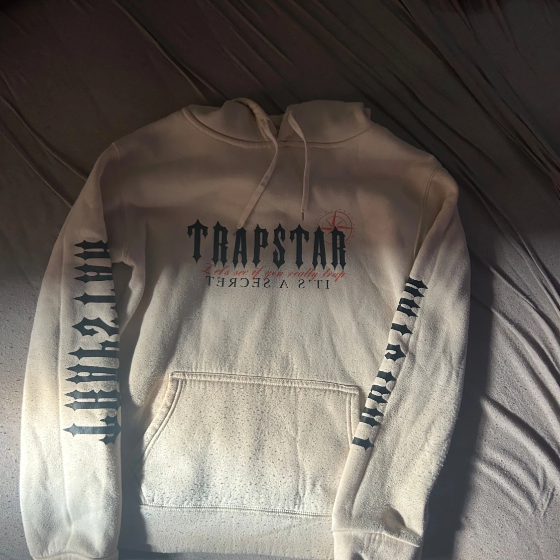 Säljer en vit hoodie från Trapstar med svart tryck på bröstet och båda ärmarna. Hoodien har huva med snörning och en stor magficka. Materialet är mjukt och skönt, perfekt för chill dagar. Snygg streetwear-vibe och coola detaljer.