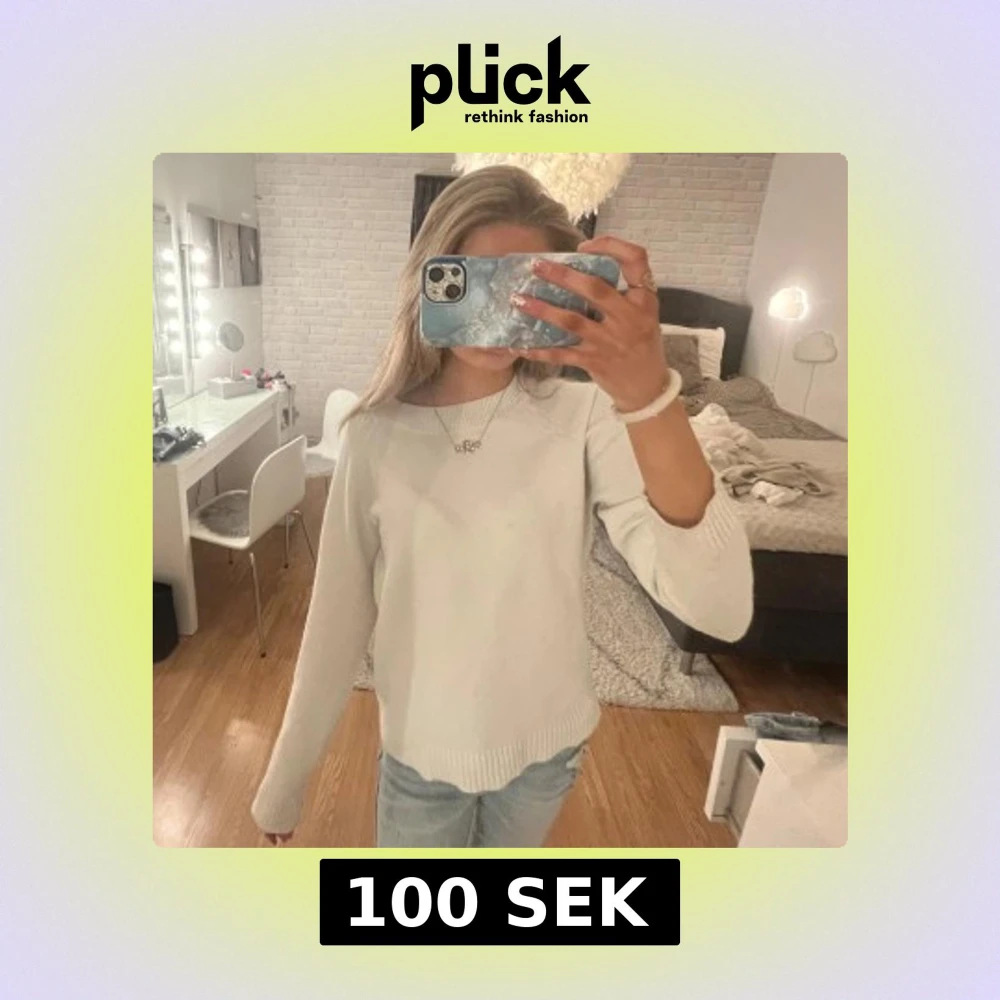 Säljer en stilren vit stickad tröja med långa ärmar. Perfekt för kyligare dagar och enkel att matcha med olika outfits. Lite nopprig och syns att den är använd, en ton av en fläck bild 2 och en mini fläck på ärmen💕