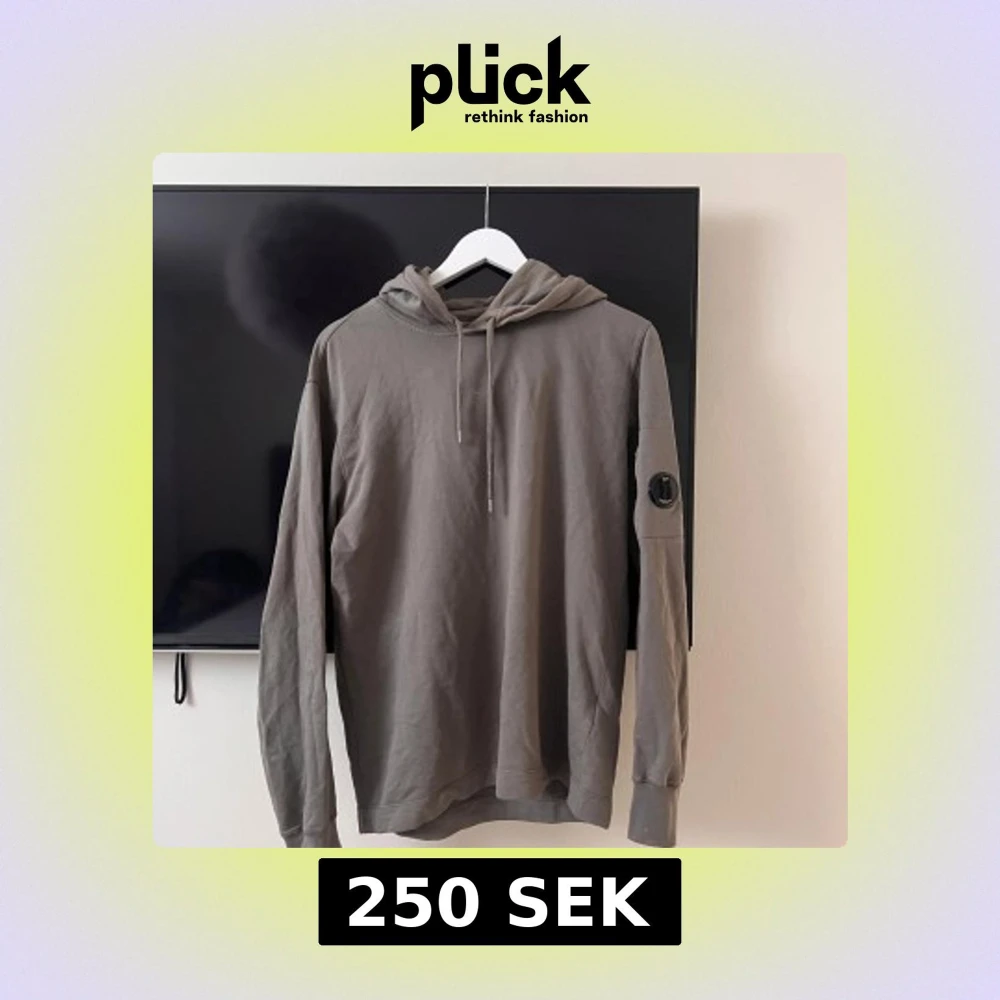 Säljer en grå hoodie från C.P. Company med huva och dragsko. Tröjan har en unik detalj med en rund lins på ena ärmen. Tillverkad i mjuk bomull, perfekt för en avslappnad stil.