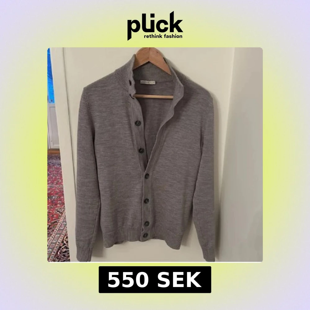 Snygg grå kofta från Suitsupply i merinoull. Den har en klassisk design med knappar framtill och ribbade muddar vid ärmslut och nederkant. Perfekt för lager-på-lager under kyligare dagar.
