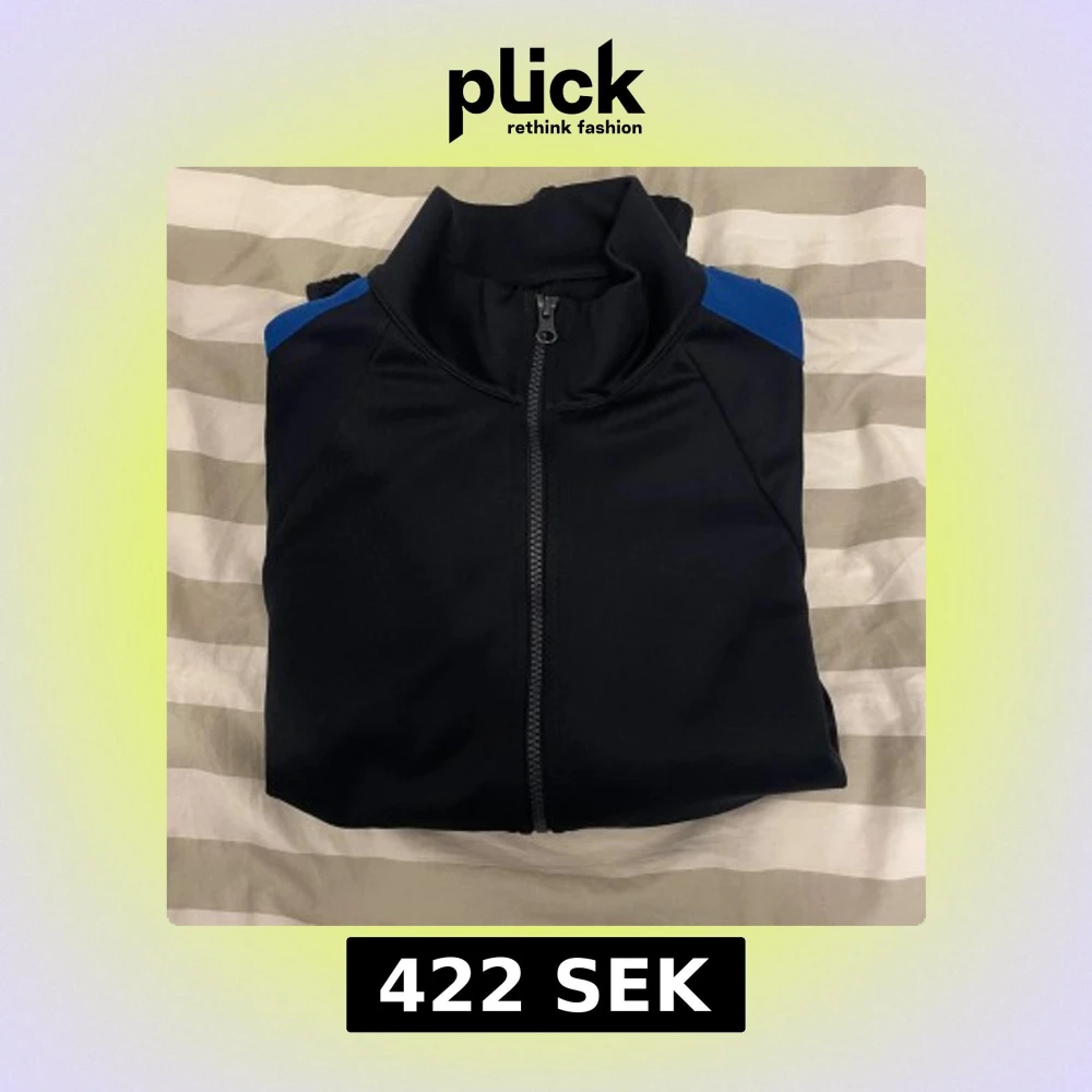 Snygg svart/marineblå kofta med blåa ränder längs ärmarna och hel dragkedja framtill. Jackan har ståkrage, två sidofickor och ribbade muddar vid midja och ärmslut. Perfekt för dig som gillar sportig stil och vill ha något lätt och bekvämt.
