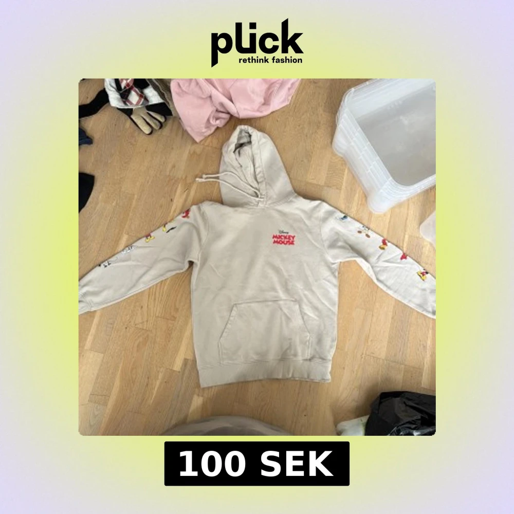 Säljer en beige hoodie från Disney med Mickey Mouse-tryck på bröstet och färgglada Disneyfigurer längs båda ärmarna. Tröjan har huva med snörning och en stor magficka. Perfekt för dig som älskar Disney och vill ha en chill och snygg look.